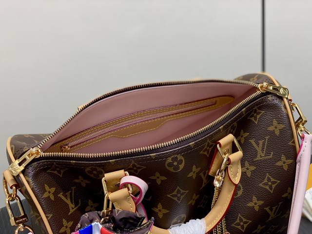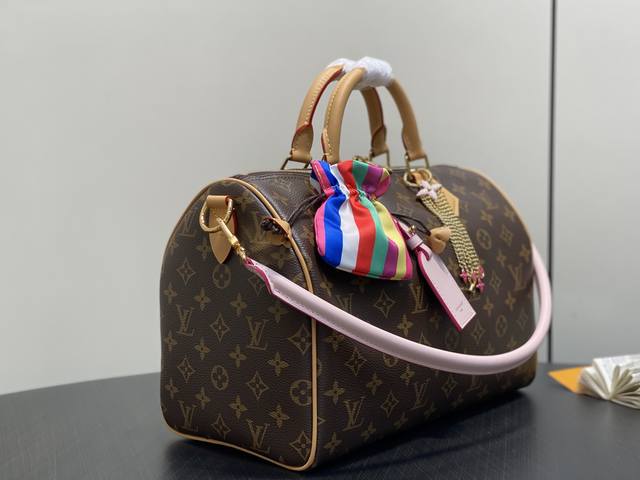 Original Quality M26498 Monogram Pink Pillow Bag Speedy. This Speedy Soft 30 handbag is from the Ski series, refreshing a classic design in Monogram Eipse canvas. Double chains, a pleated leather key pouch, and the signature padlock showcase exquisite details. The perfect size to accommodate a tablet and everyday essentials. Dimensions: 21 x 17 x 30 cm (H x W x Length)