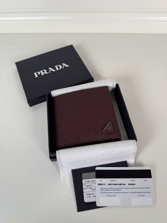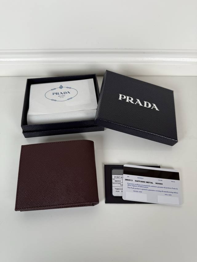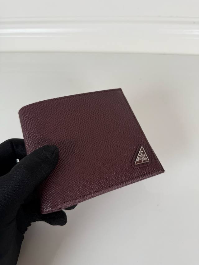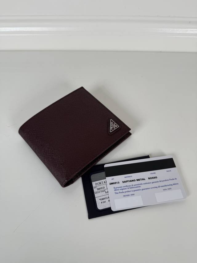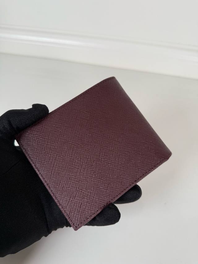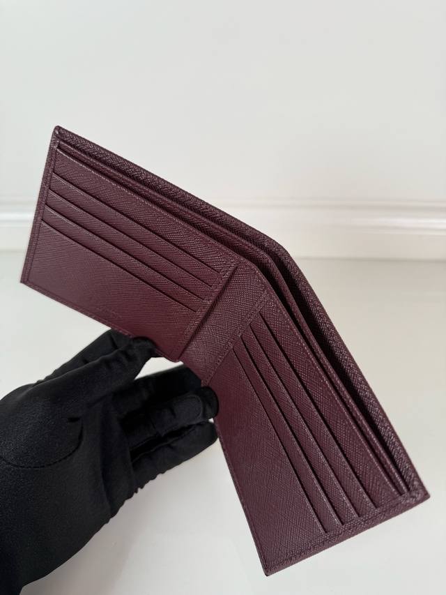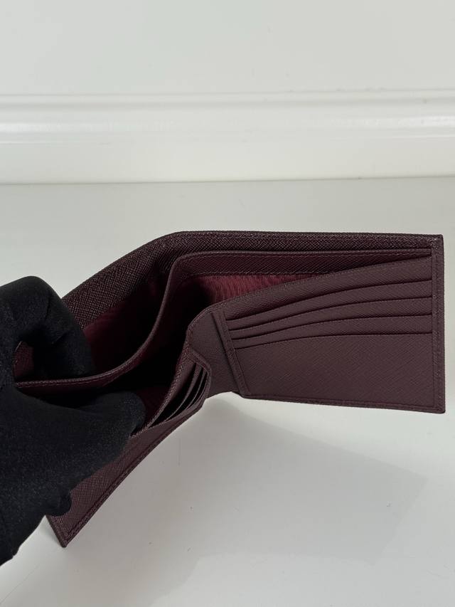 p brand men's short wallet, Bordeaux red, model 2M0513, made of cross-grain cowhide, eight card slots, length 11cm, height 9.5cm.