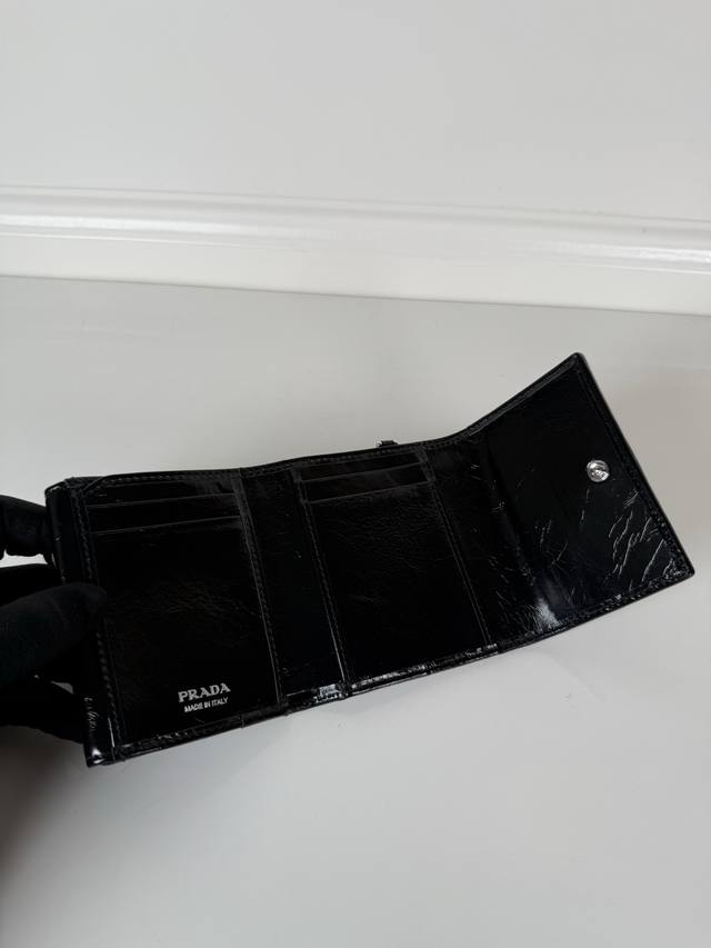 p brand women's oil-waxed leather short wallet, original quality, model 1Mh043, four card slots, one ticket compartment, two document pockets, one external pocket, and one internal flap coin pocket, dimensions 10X8.5Cm.