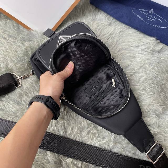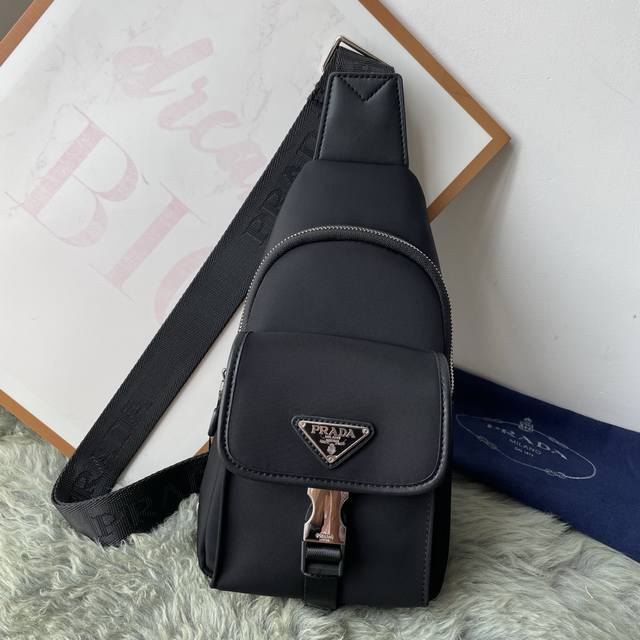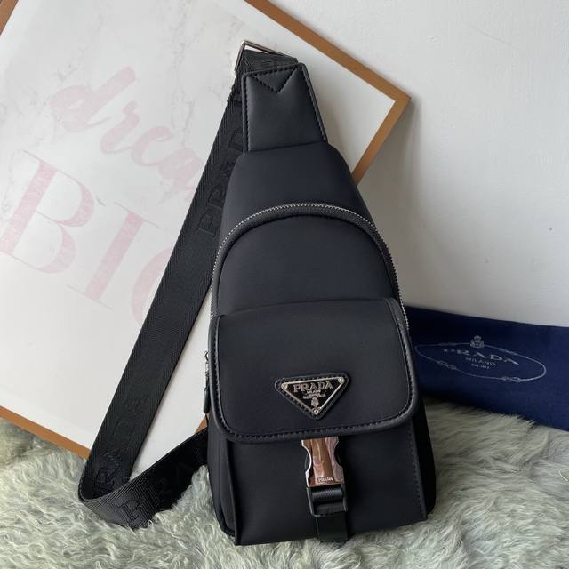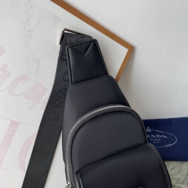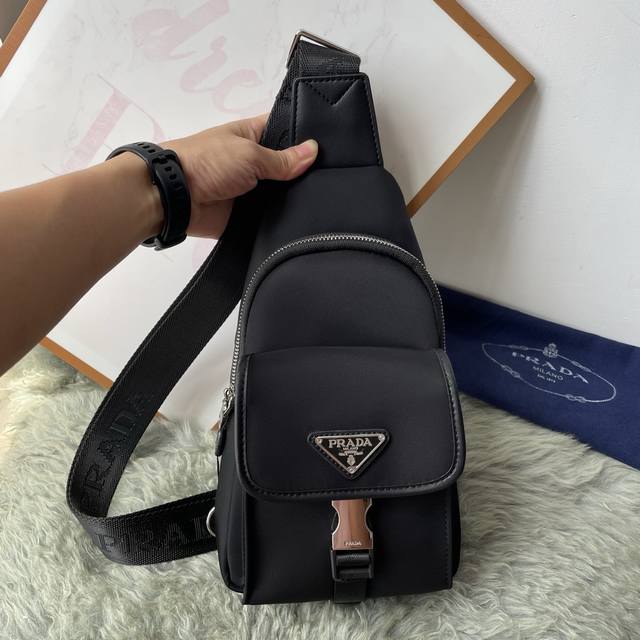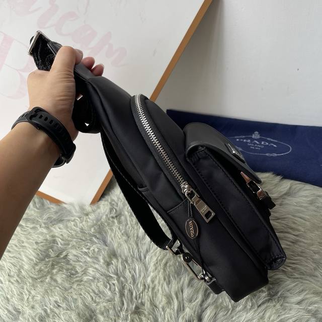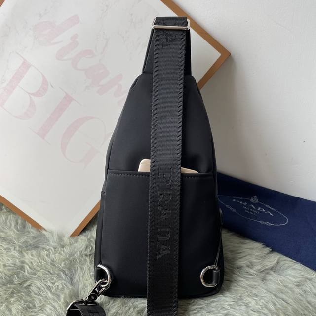 Prada black chest bag, made of lightweight and durable nylon, with the classic triangle logo signifying its status. Leather accents enhance its texture, and the adjustable shoulder strap accommodates various body types. Practical pockets make it suitable for everyday wear and trendy outings, easily achieving a stylish look. It's a versatile piece that combines functionality and style. Model: 2082, Dimensions: 30