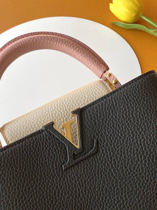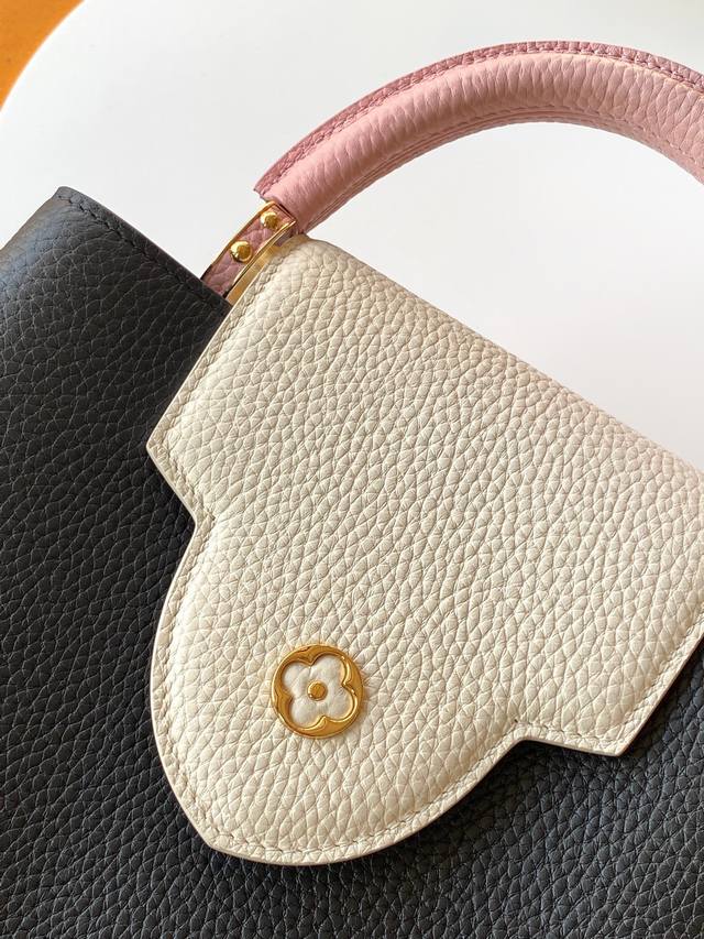 Premium all-steel M20844 imported cowhide leather in black with a light cherry blossom pink floral trio. This Capucines Bb handbag is crafted from imported Taurillon leather, featuring subtle variations in color, adding a touch of class to the classic silhouette. It features an enamel Monogram floral chain and can be carried by hand, by the elbow, or with a shoulder strap, or worn cross-body. Details: 27 x 18 x 9 cm (Length x Height x Width)