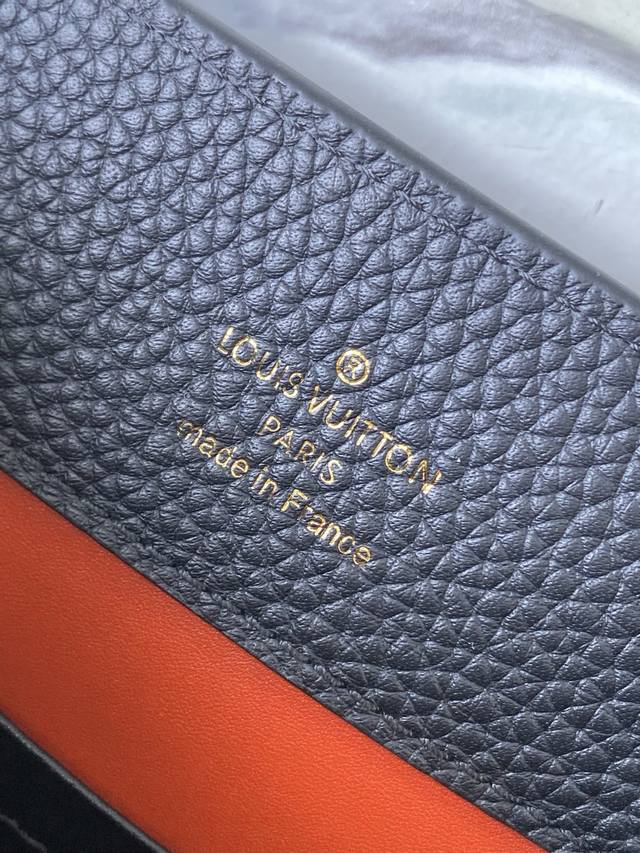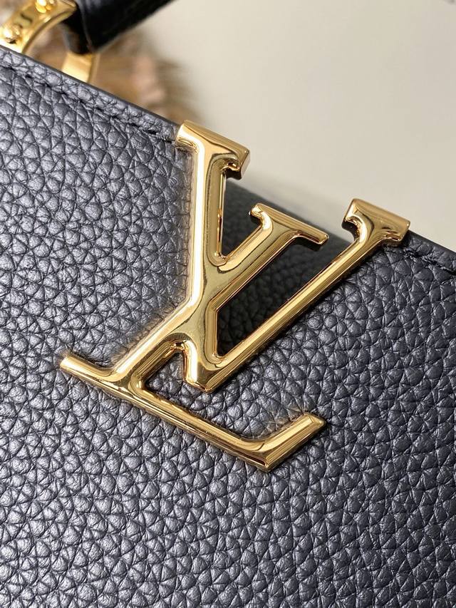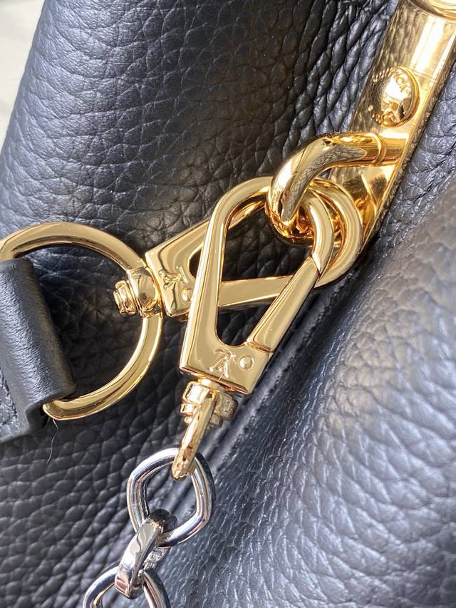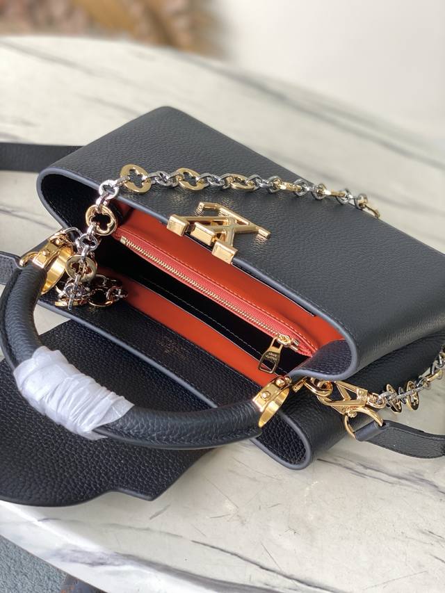 Premium Genuine Leather M12936 Small Black. This Capucines Bb handbag is crafted from supple Taurillon cowhide. Its jewel-like double-plated chain and Monogram floral motifs highlight its Chain On You line. The flap can be positioned inside or outside, and the ample interior and multiple pockets provide ample storage for everyday essentials. The rounded V lettering adds a touch of ingenuity. Dimensions: 27