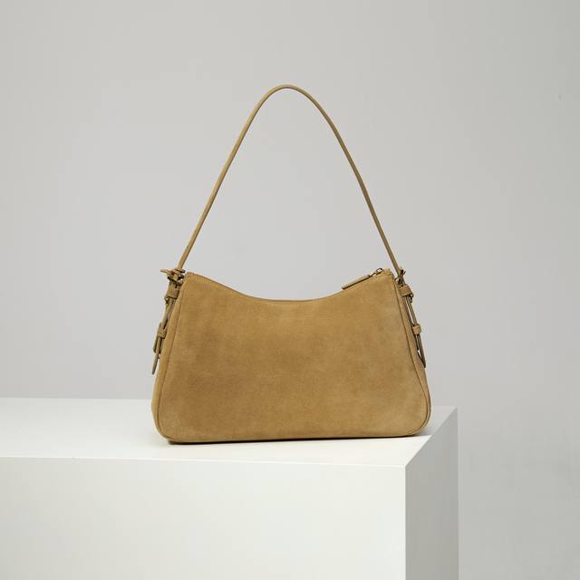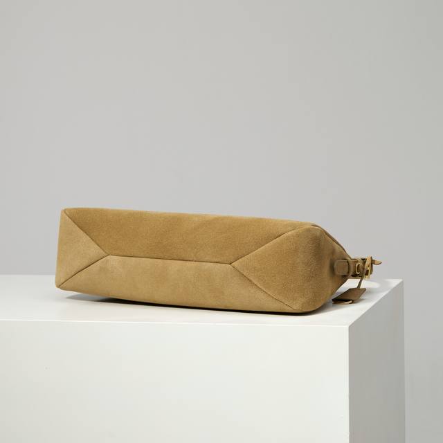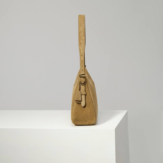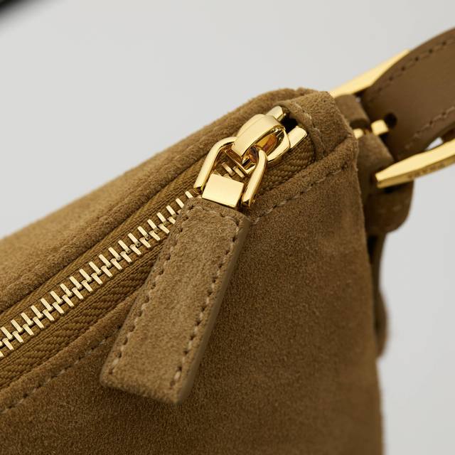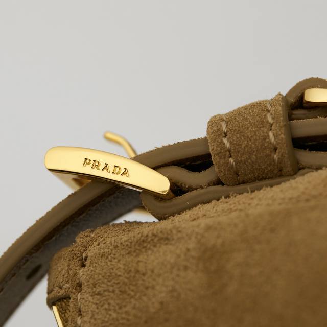 Premium Original 1Bc228 Cinnamon Nude Suede Prada Etude Large Handbag. The new Prada Aimee handbag featured in the 2025 Fall/Winter advertising campaign draws inspiration from the sophisticated and elegant minimalist style of the 1990s. The Hobo style blends contemporary lines with archive details. Crafted from supple suede cowhide, it incorporates the natural movement of carrying a bag into its design, and can be worn on the shoulder or crossbody. Features include: handle, detachable key ring, metal hardware, enamel triangular metal logo, zip closure, two interior pockets including one zip pocket, and dimensions of 39cm (W) x 23cm (H) x 12cm (L).