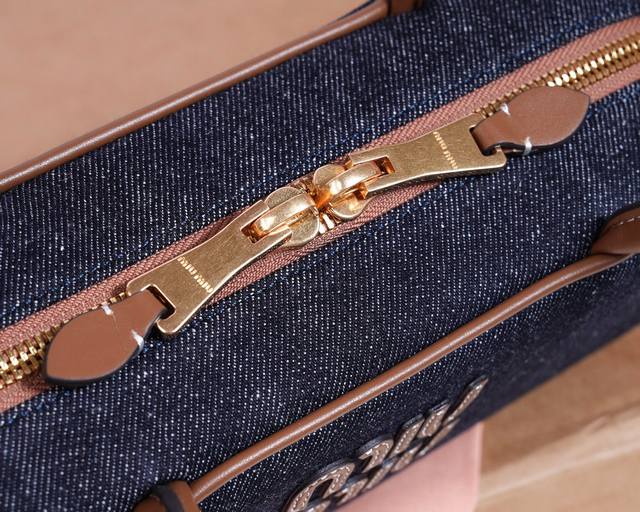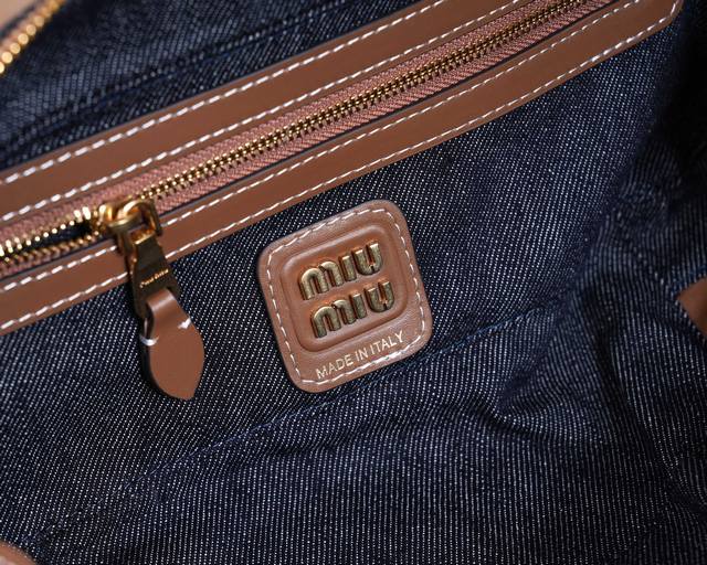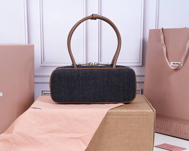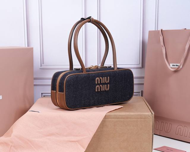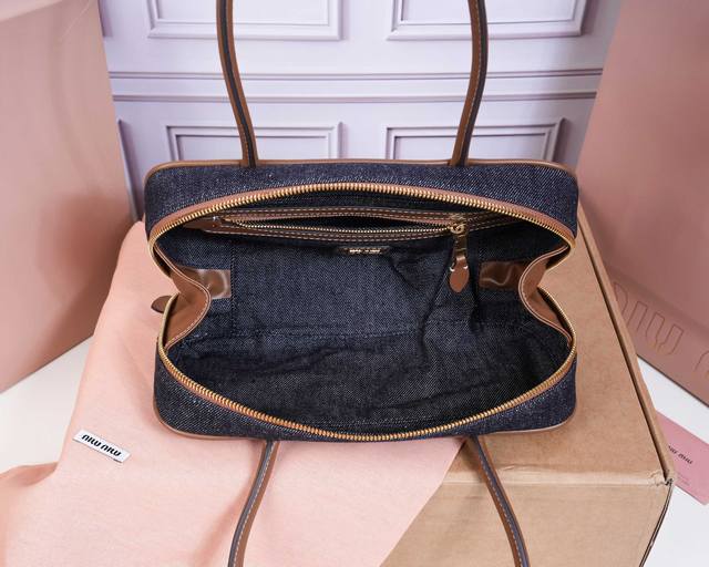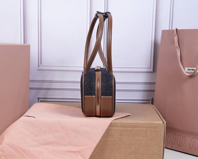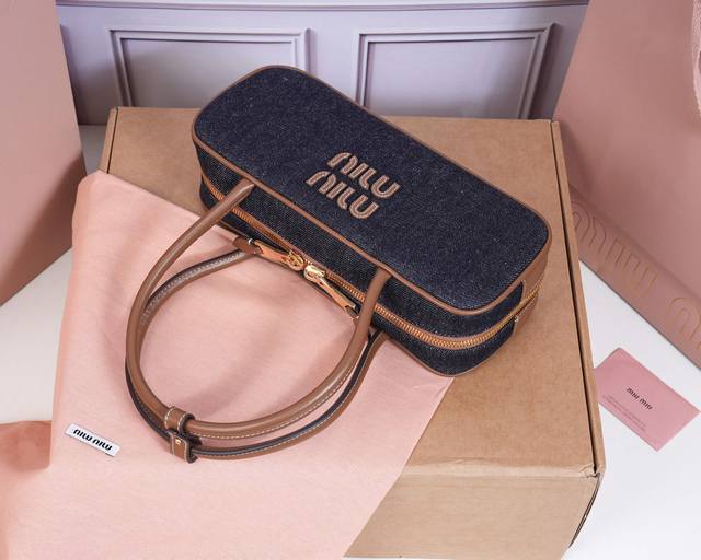 Premium Original Leather 5Bb173M's new canvas bowling bag, made with brand new denim fabric paired with high-grade plain calfskin. The bold and innovative design perfectly embodies Miu's unconventional, carefree, and inclusive attitude towards life. This bag is cool, showcasing exquisite multi-functional design, blending menswear and womenswear elements. It's casual, relaxed, naturally chic, and full of personality. The new canvas lining is a testament to its popularity online; it's loved by fashion bloggers and celebrities alike. Dimensions: 28X12X9Cm. Comes with full original packaging.