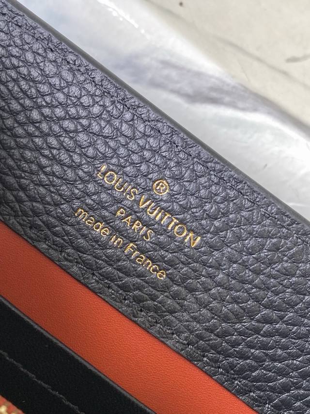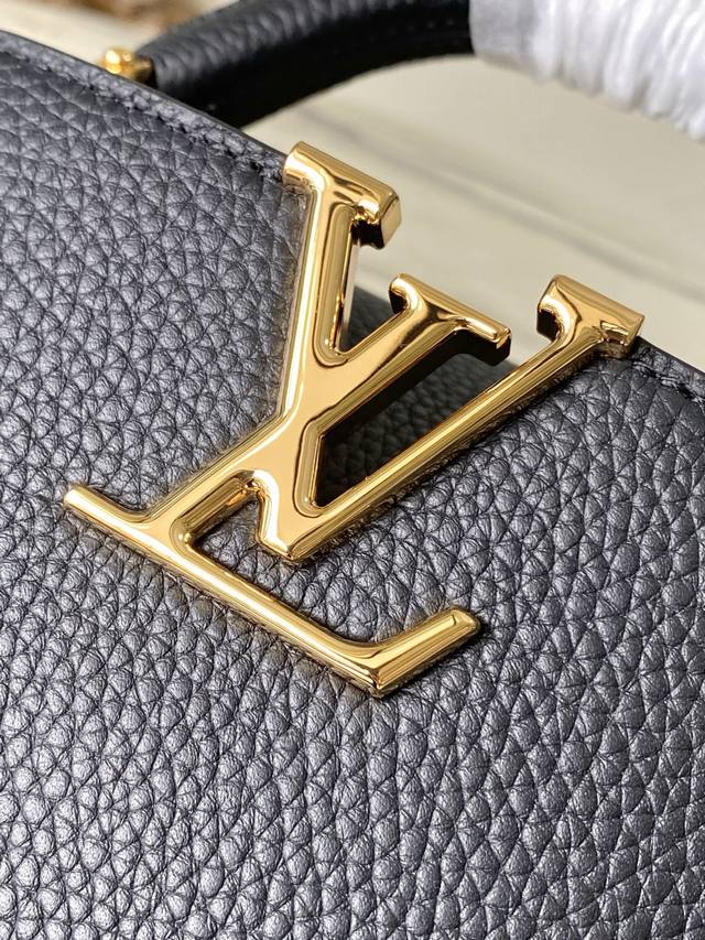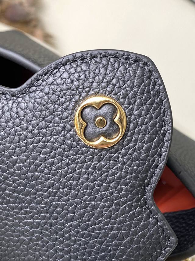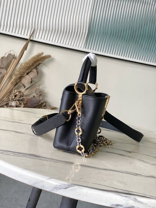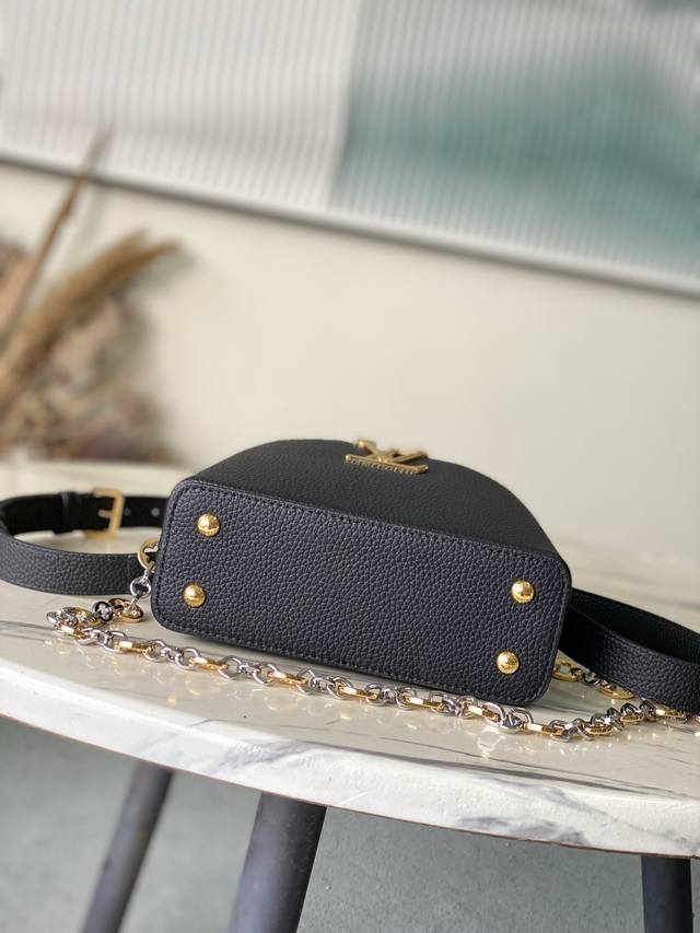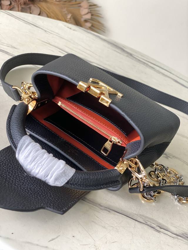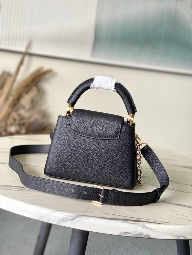 Premium Original Leather M12936 Black Mini. This Capucines Mini handbag is crafted from supple Taurillon cowhide leather. Its jewel-like double-plated chain and Monogram floral motif highlight its Chain On You line. The flap can be positioned inside or outside, and the ample interior pockets provide ample storage for everyday essentials. The rounded V lettering adds a touch of craftsmanship. Dimensions: 21