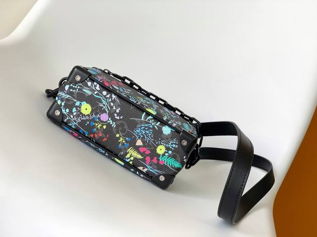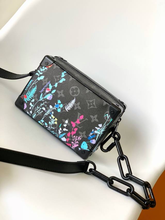 Premium original M69072 silk-screened Mini Soft Trunk handbag featuring the iconic Monogram print. This charming handbag, with its sharp angles and elegant design, showcases a modern interpretation of trunk-making tradition. The resin chain offers versatile carrying options, suitable for shoulder or hand carry. Dimensions: 18.5 x 13 x 8 cm