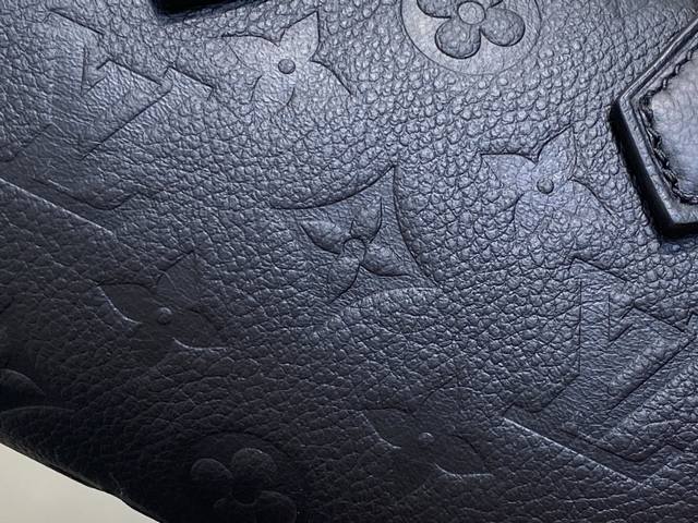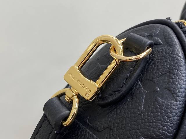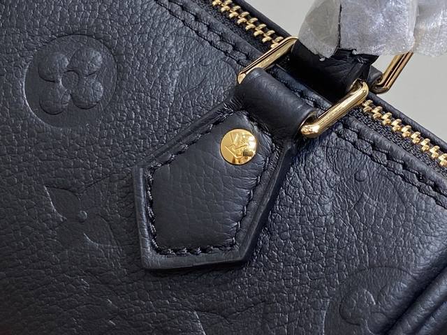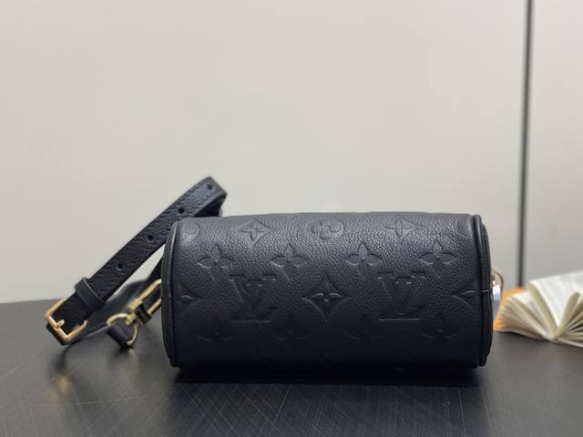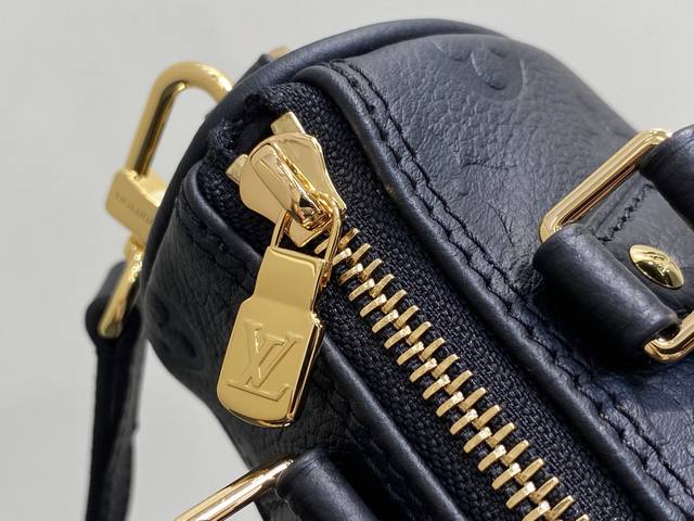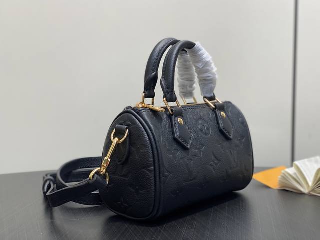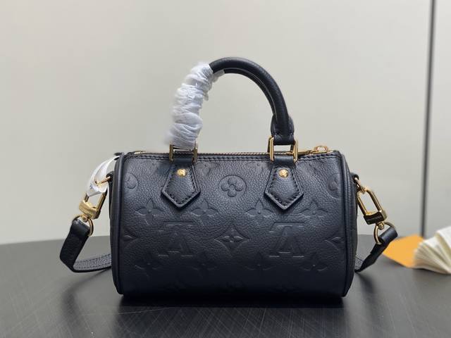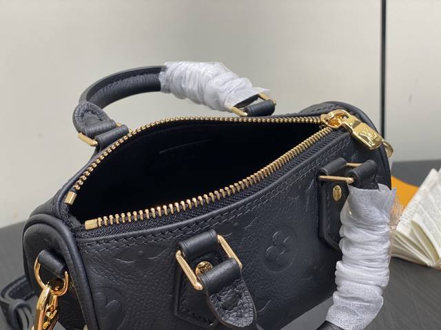 Premium original M82450 black embossed leather Speedy pillow bag. This Nano Speedy handbag, crafted from Monogram Empreinte embossed leather, embodies the classic Speedy shape and expertly crafted to create a romantic, starry sky-like shimmer, embodying the Summer Stardust collection's design philosophy. A detachable and adjustable shoulder strap allows for versatile carrying options. Dimensions: 16 x 10 x 7.5 cm.