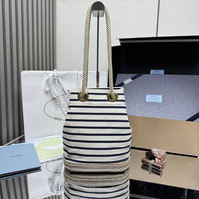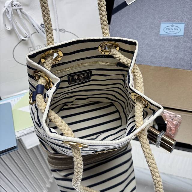 Premium Original New Bucket Bag 1Be082 Striped Style This fabric bucket bag features a nautical striped pattern, adding a touch of color. The base design is inspired by espadrilles, and the rope is another detail that symbolizes the nautical world, creating a rich summer atmosphere. Premium hardware and spacious storage make it a casual and stylish summer must-have and a timeless favorite. Hurry and get yours! Dimensions: Length 28 x Height 23.5 x Base 15cm