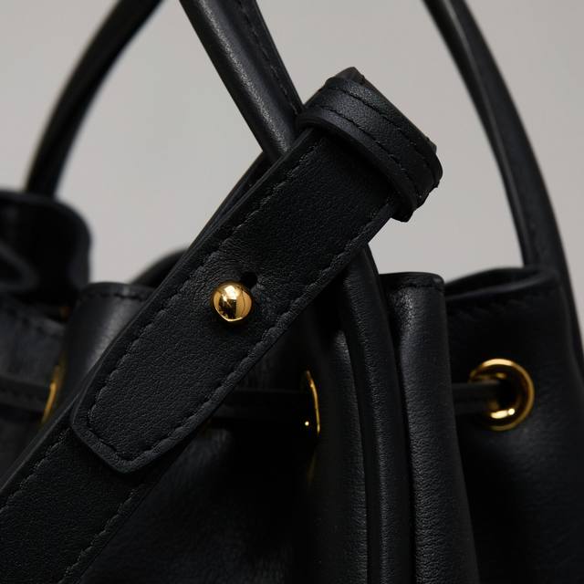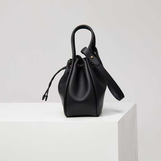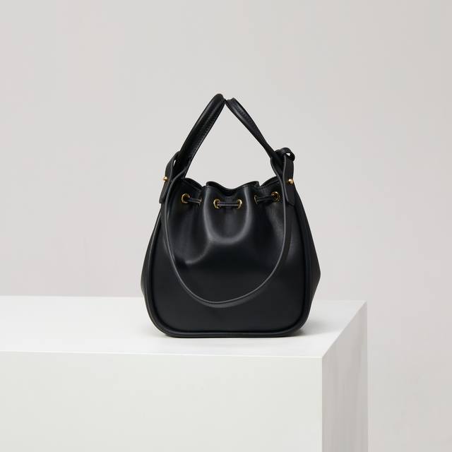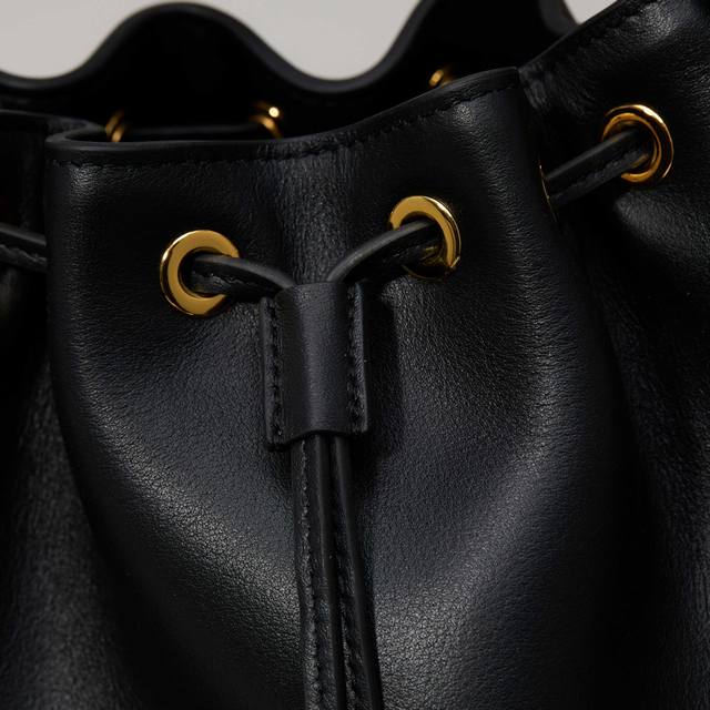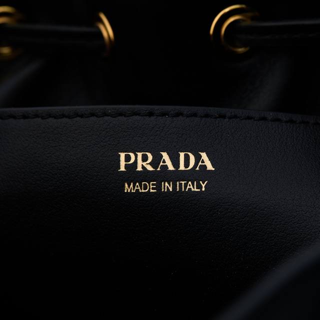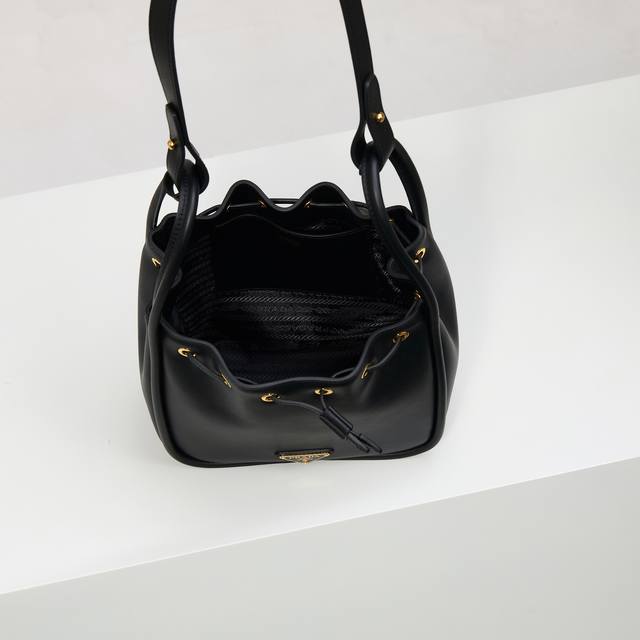 Premium Original New Bucket Bag 1Be087 Black. This bucket bag is made of exquisite and noble calfskin and comes with a detachable long shoulder strap, offering multiple carrying options. It can be carried by hand or over the shoulder, and features a drawstring closure. Highly functional, it's spacious, and looks great and stylish. Grab one now! Dimensions: Length 22cm x Height 21cm x Base 10.5cm.