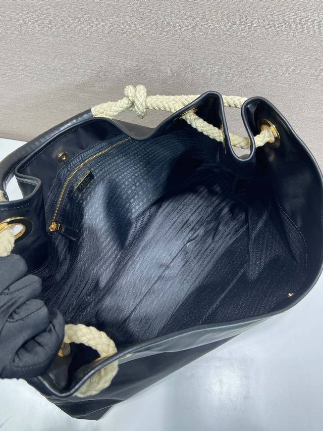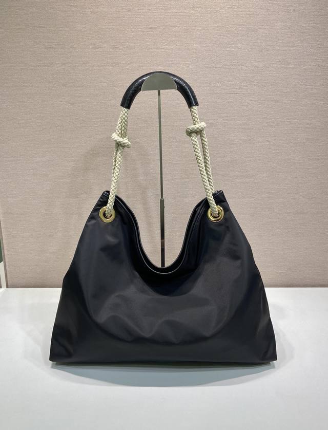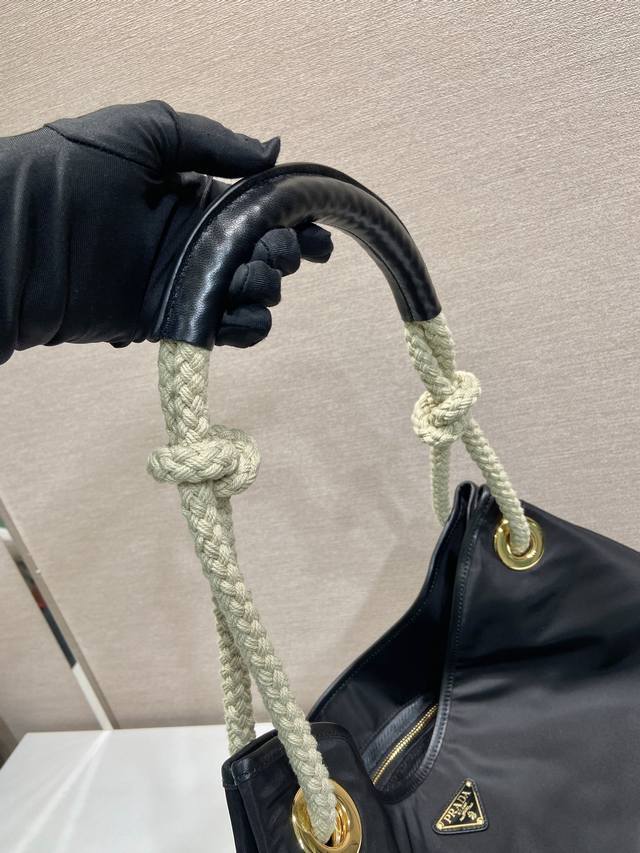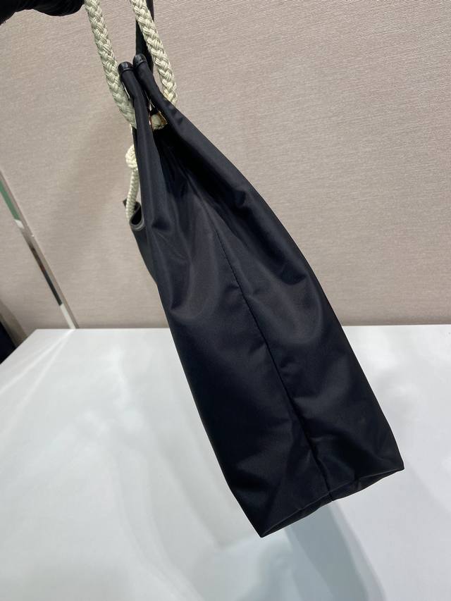 This recycled nylon bag draws inspiration from classic nautical elements, featuring novel and exquisite combinations that showcase a vibrant and individual style. The sliding braided handle outlines the oversized silhouette of this versatile accessory, while the enamel triangular metal logo highlights the brand identity. It boasts a large capacity, a very attractive look, is lightweight and practical, and is another timeless bestseller