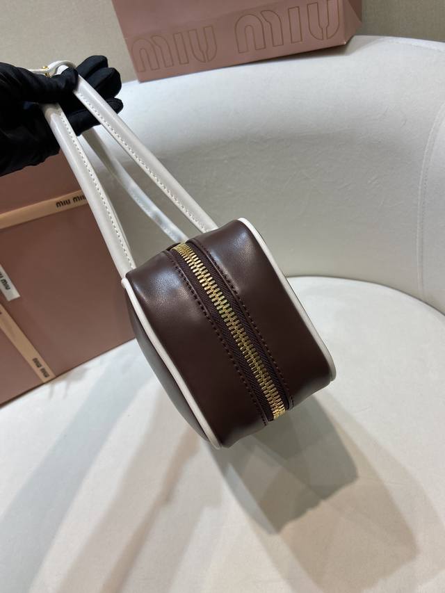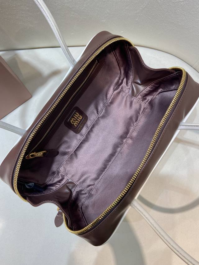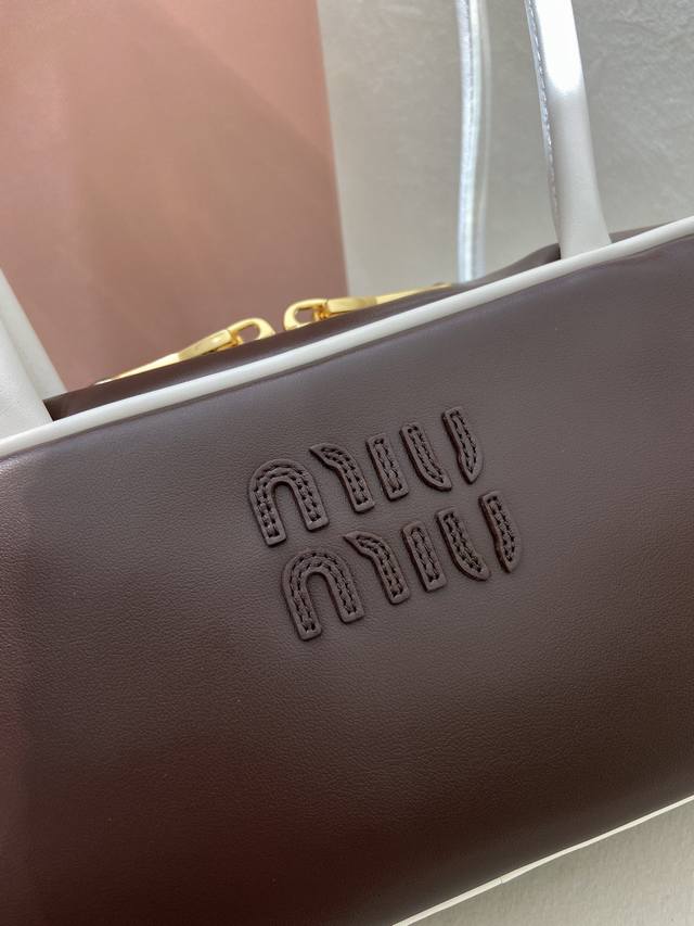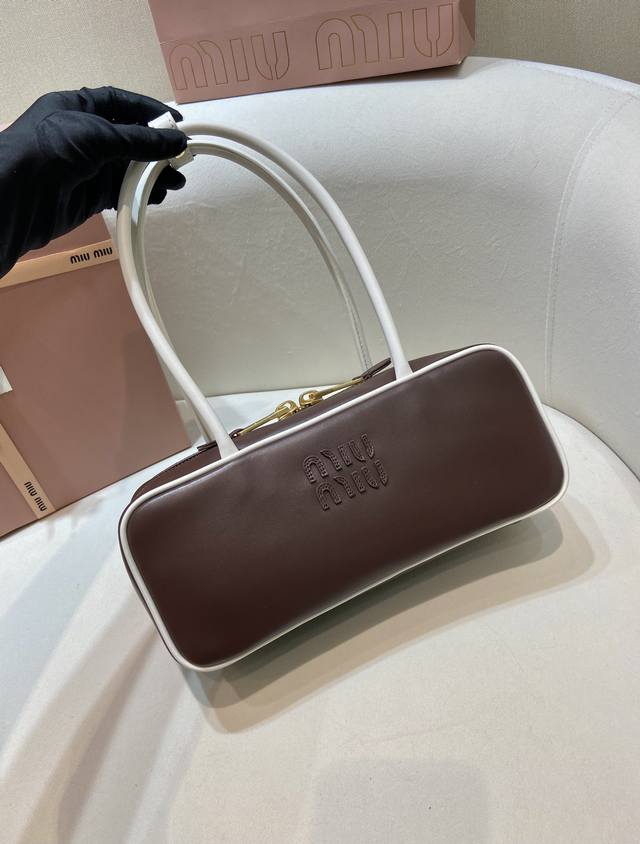 Premium Original Product 5Bb173 Small Size This Beau handbag features contrasting handles and piping, making the lines of the handle design more striking and highlighting the iconic sporty style and functional evolution of Miu. It has a zip closure, gold-tone hardware, a twill lining, two zip pockets, and a leather logo on the front. It satisfies both capacity and style. Grab one now ! Length 28cm x Height 11.5cm x Base 8cm