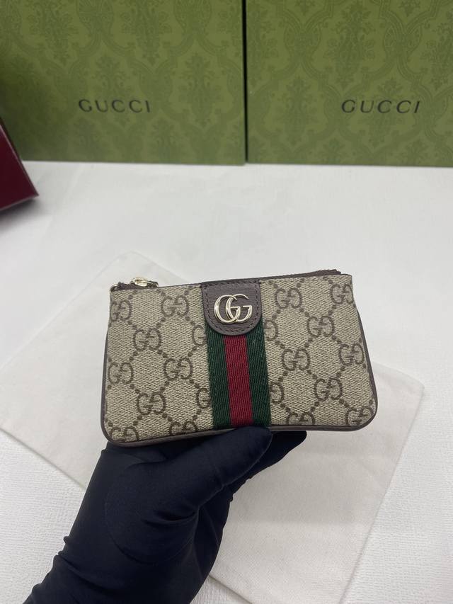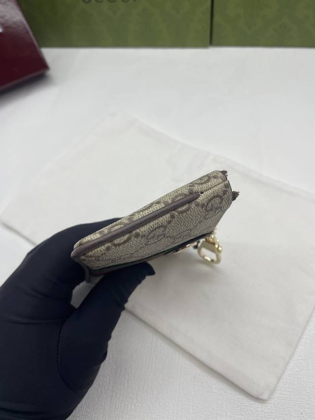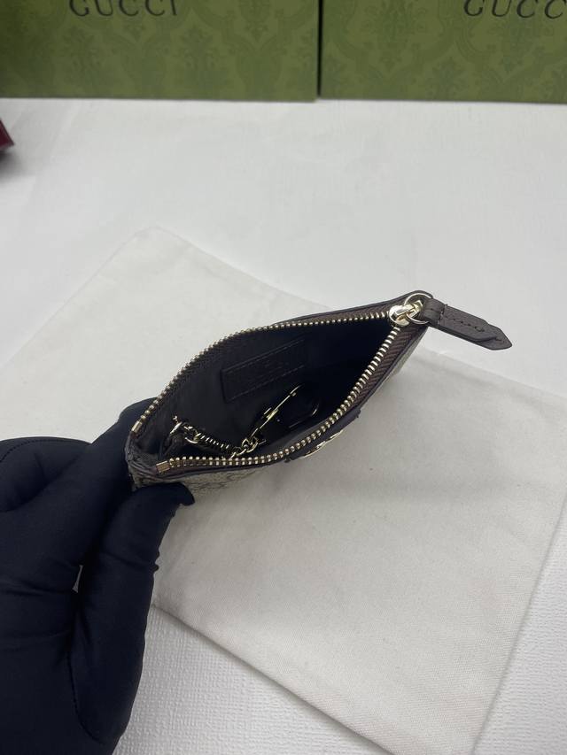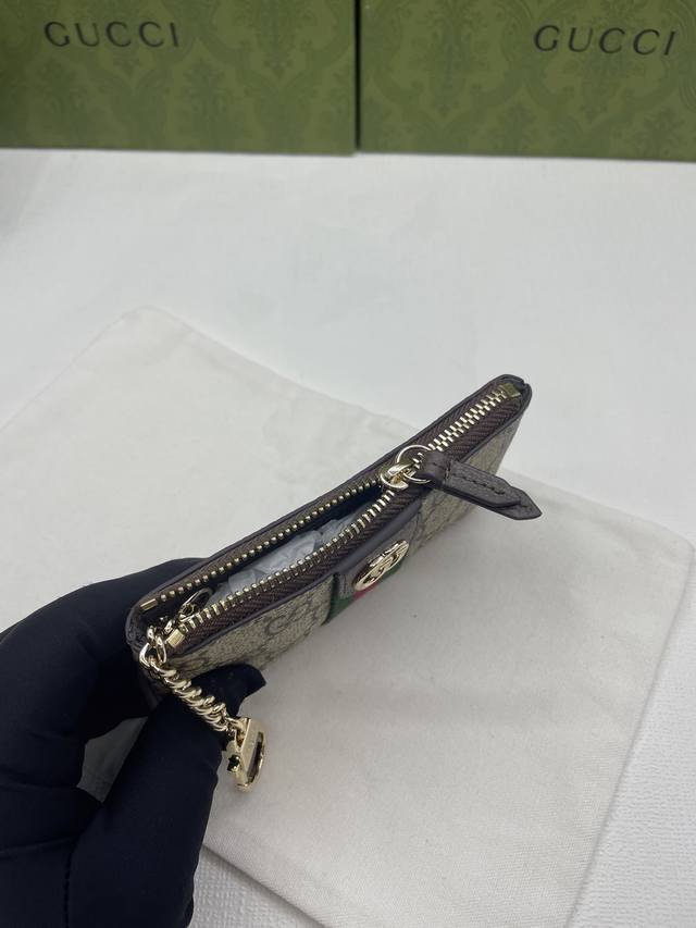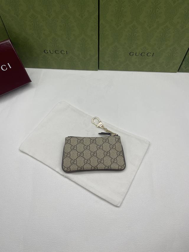 , presents striking new silhouettes and practical functional designs, crafted with a signature beige and encore red color scheme to create soft and supple accessory pieces. This zippered key pouch is a prime example. Model: 838466. Dimensions: 13.5 cm wide x 7.5 cm high x 1 cm deep.