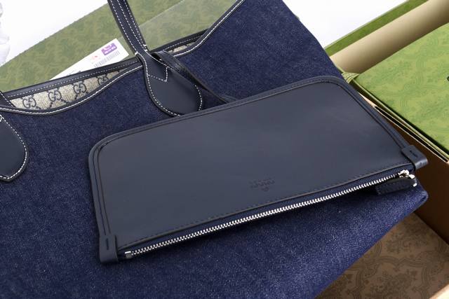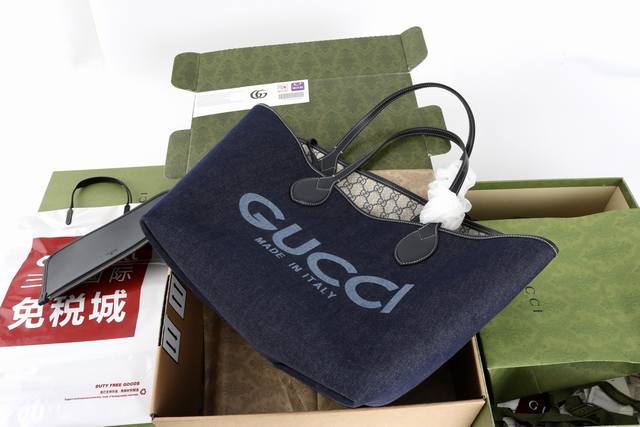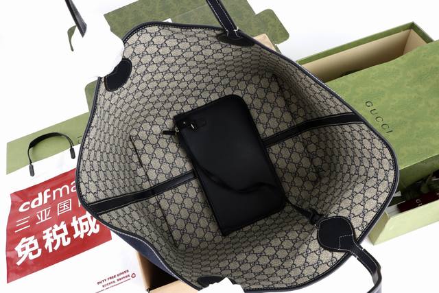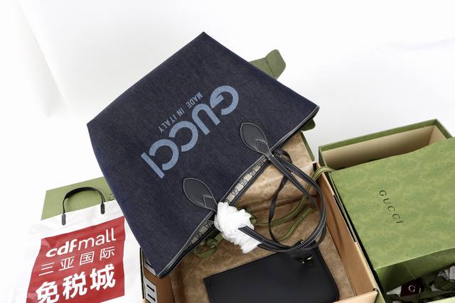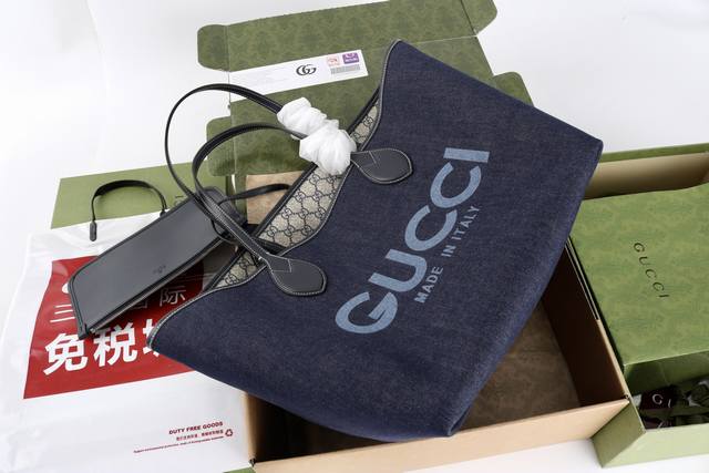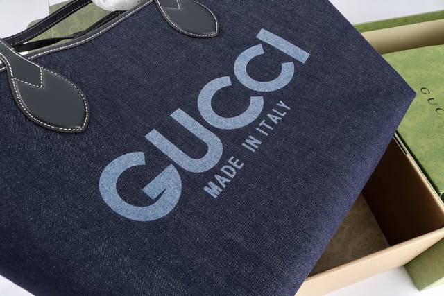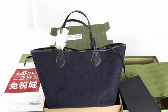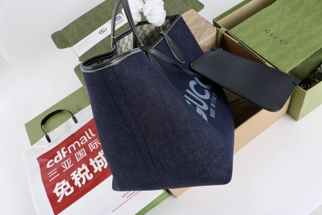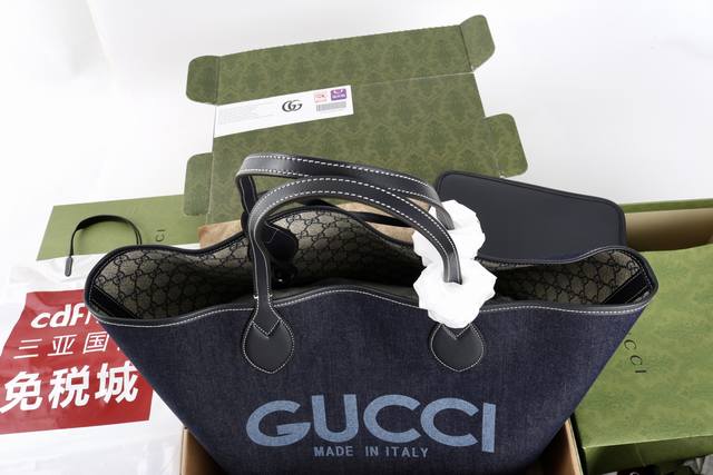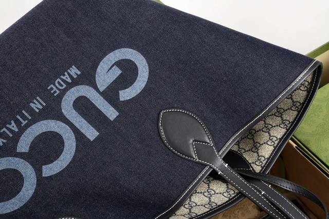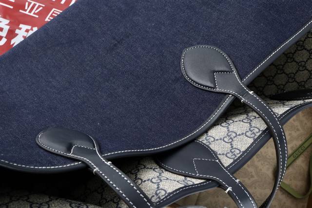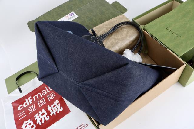 Blue Gg denim with brown leather trim, contrasting stitching, blue cotton and linen lining, and a 21cm high top handle.