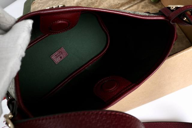 , Anchor red leather trim, light gold-toned hardware, green cotton lining, and red and green webbing