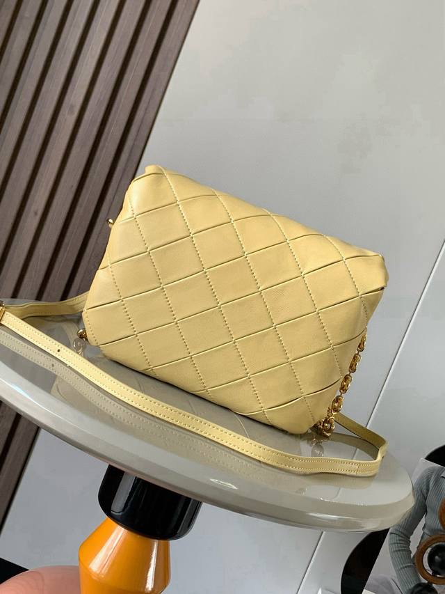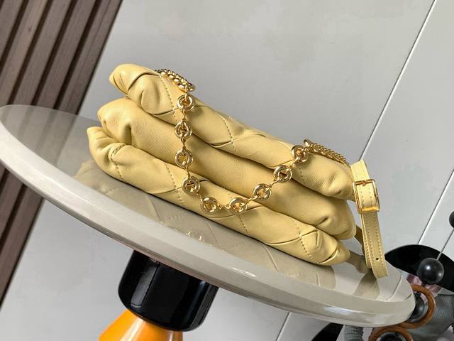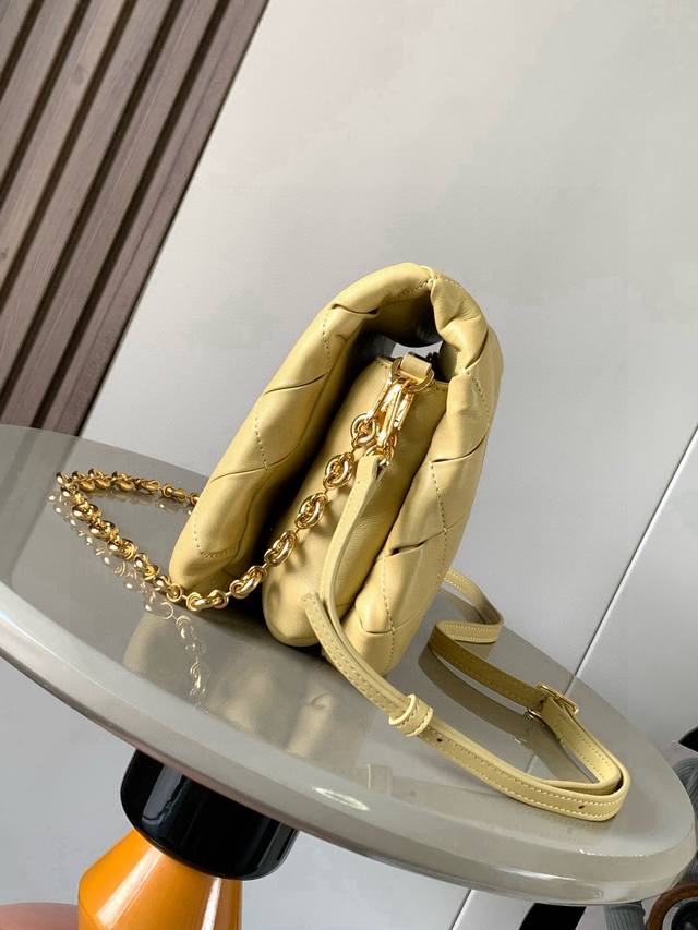 Puffer Goya Handbag in Glittering Nappa Lamb Leather. Inspired by the Goya aesthetic, the Puffer Goya brings a new sensory and tactile dimension through glittering Nappa lamb leather with goose feather lining. Features a detachable and adjustable metal donut chain and a detachable leather strap. This version is crafted from pleated lamb leather through cutting, stitching, and hand weaving. * Shoulder or hand carry * Magnetic closure * This handbag features a detachable chain and a leather strap * One main compartment, one zip pocket, and one slip pocket * Nappa lamb leather lining DDD Dimensions: 23cm