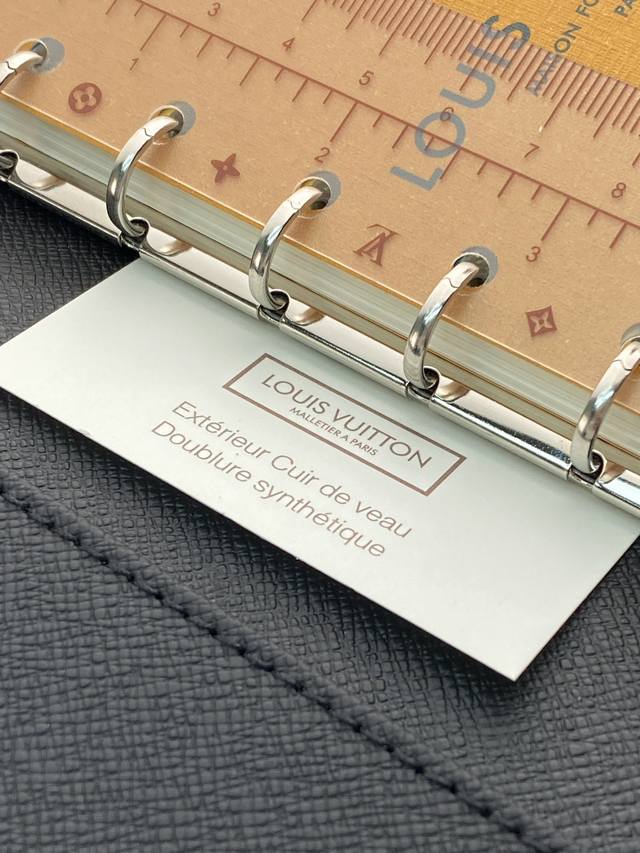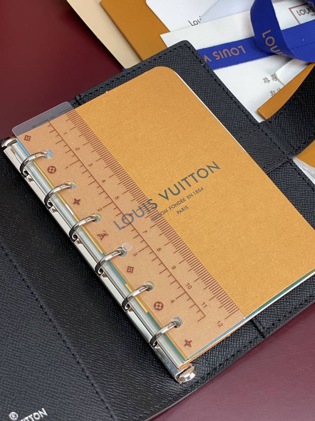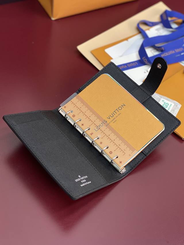 R20005 Black Flower Chip Edition! Small loose-leaf notebook cover. Crafted from Monogram canvas, this compact notebook holds three credit cards and can also be used as an address book, notebook, or calendar. Features Monogram canvas exterior, grained leather lining, button closure, six loose-leaf rings, and three credit card slots. Dimensions: 14.5 x 2 x 10 cm. Height x Width x Length.