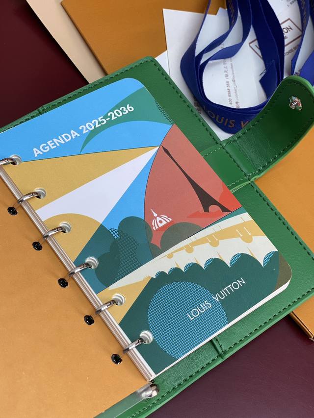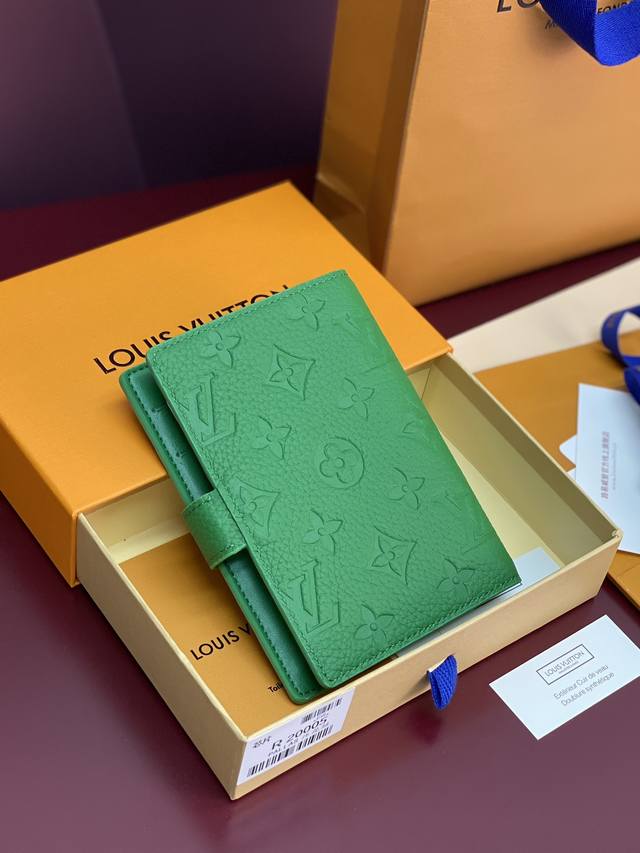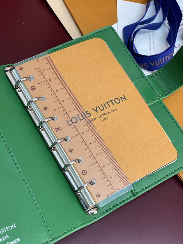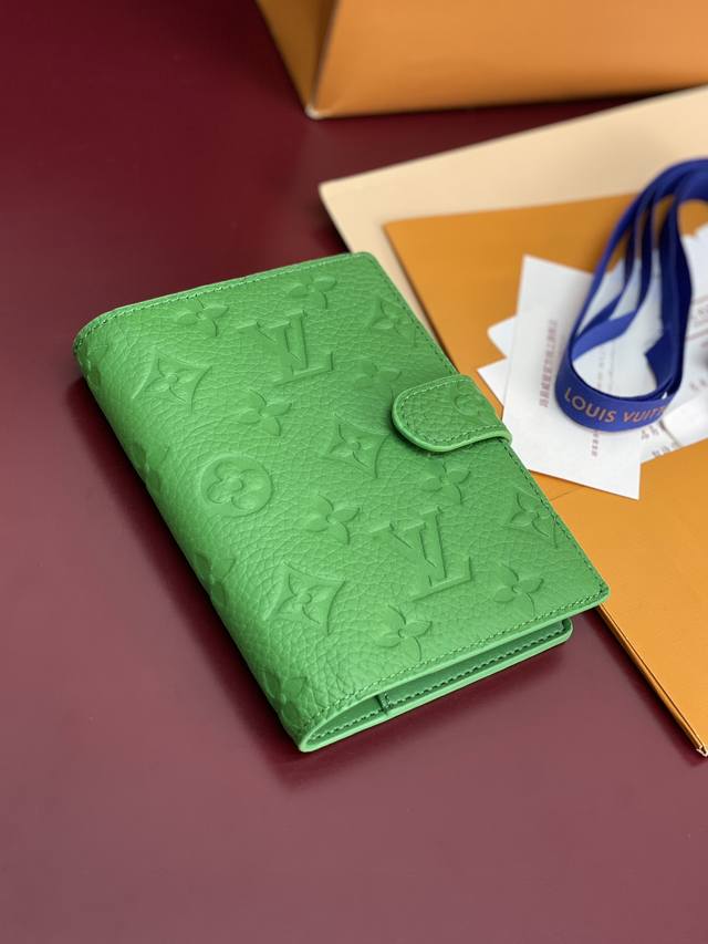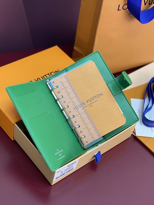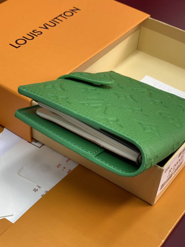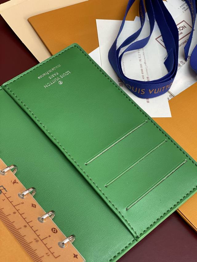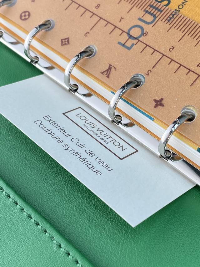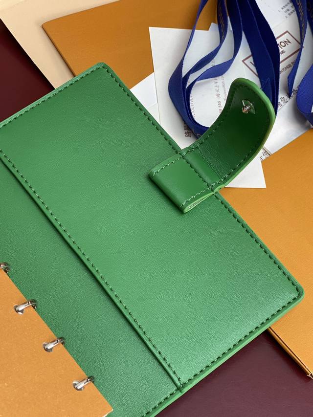 R20005 Embossed green chip edition! Small loose-leaf planner cover. Made of Monogram canvas, this small planner holds three credit cards and can also be used as an address book, notebook, or calendar.