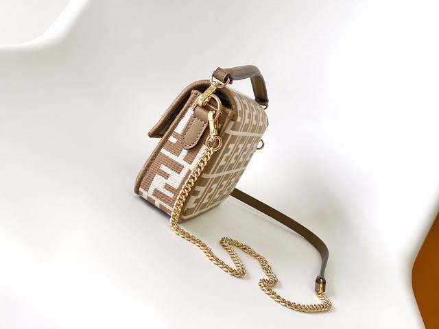 Small Baguette handbag, made of jacquard fabric, decorated with the iconic Ff pattern, embellished with tone-on-tone embroidery trim, with an interior pocket and gold-finished metal hardware. The handbag has a detachable handle and chain shoulder strap, which can be carried by hand, on the shoulder or crossbody. 20-5-13Cm Style No.: 5003