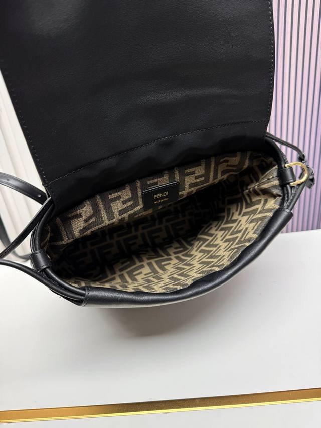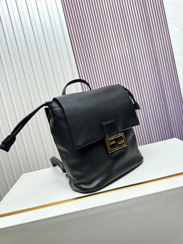 Soft, structured backpack with Ff buckle. DDD's signature tobacco brown Ff jacquard material with a bottom and dark brown calfskin details. DDD Features a front flap with magnetic snap closure, drawstring closure, tonal leather straps, and custom details. Lined interior compartment with gold-tone hardware. Adjustable leather handles and thin shoulder straps. Made in Italy. DDD Material: Outer fabric : fabric, split cowhide; Lining: fabric. DDD Dimensions: DDD Height: 26cm, Depth: 12cm, Length: 23cm, Weight: 0.58kg, Shoulder strap length: 45cm. DDD