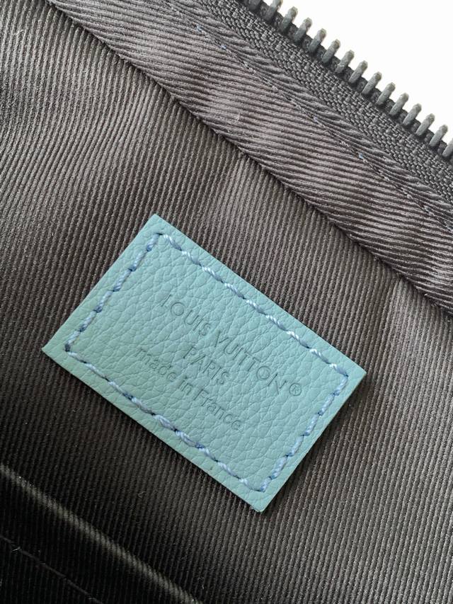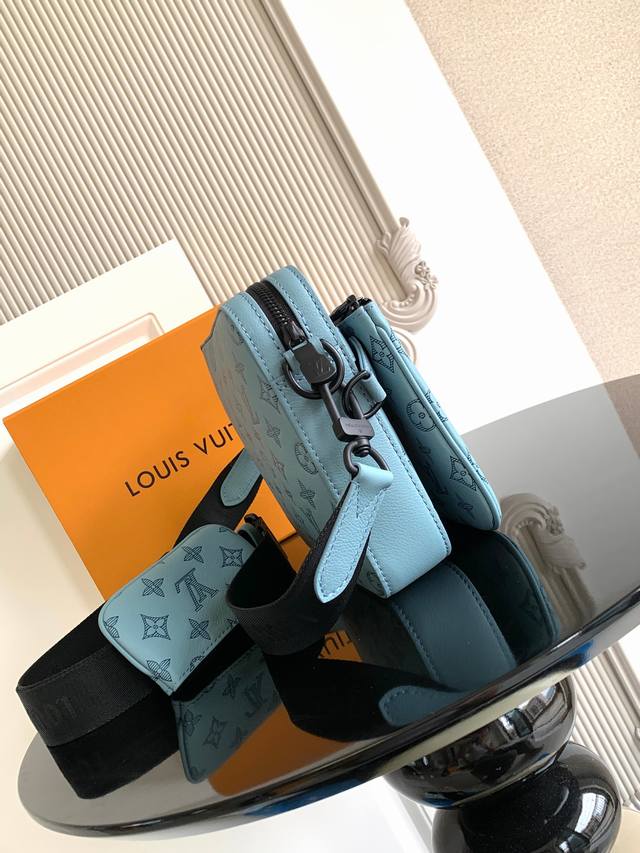 This messenger bag is crafted from embossed cowhide leather, featuring a pattern that enhances a fresh, outdoor feel. The coin purse and front zippered pocket are both removable, creating a three-in-one design with the main compartment.