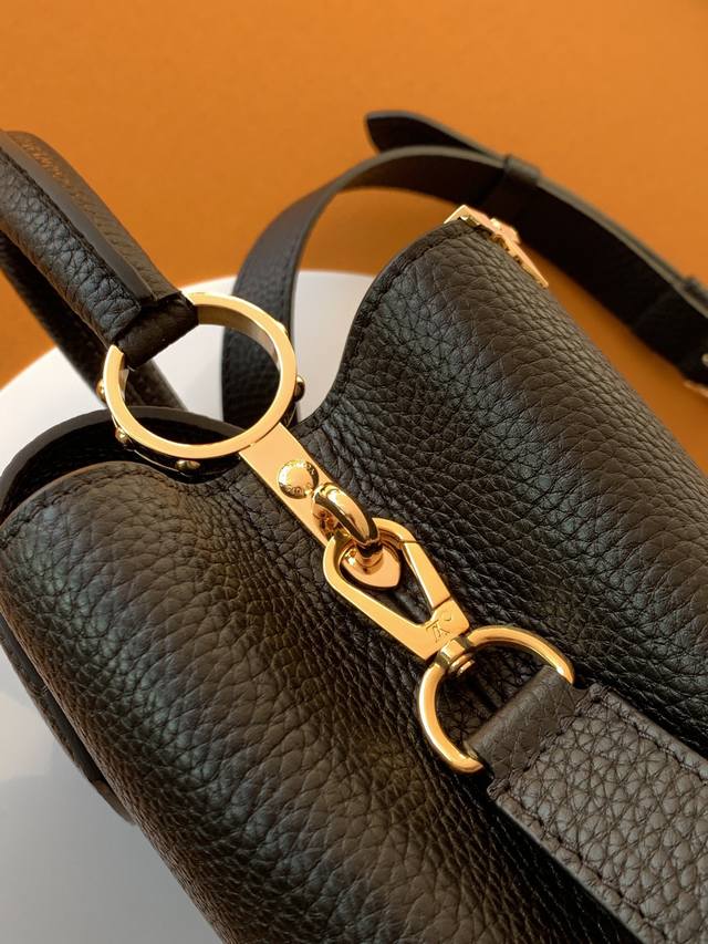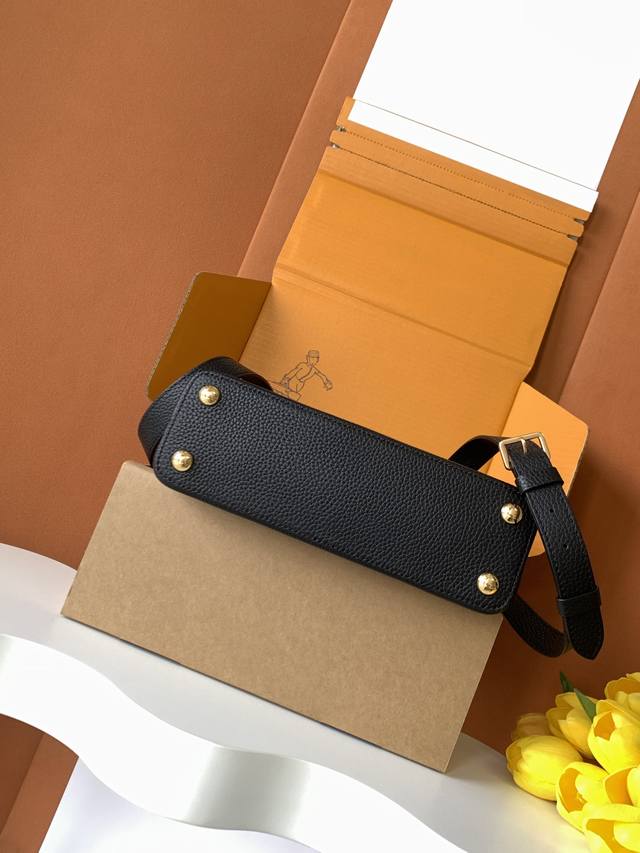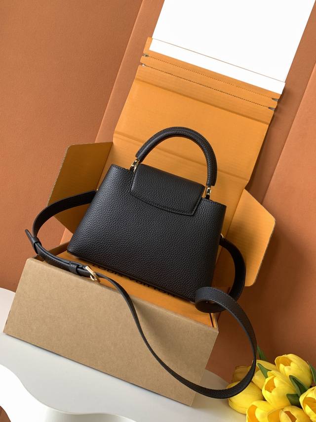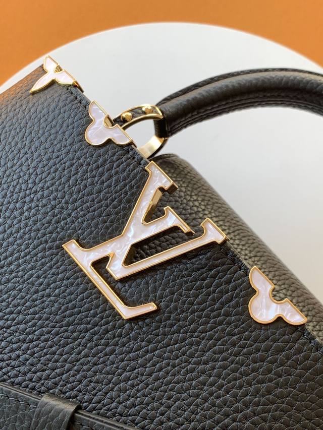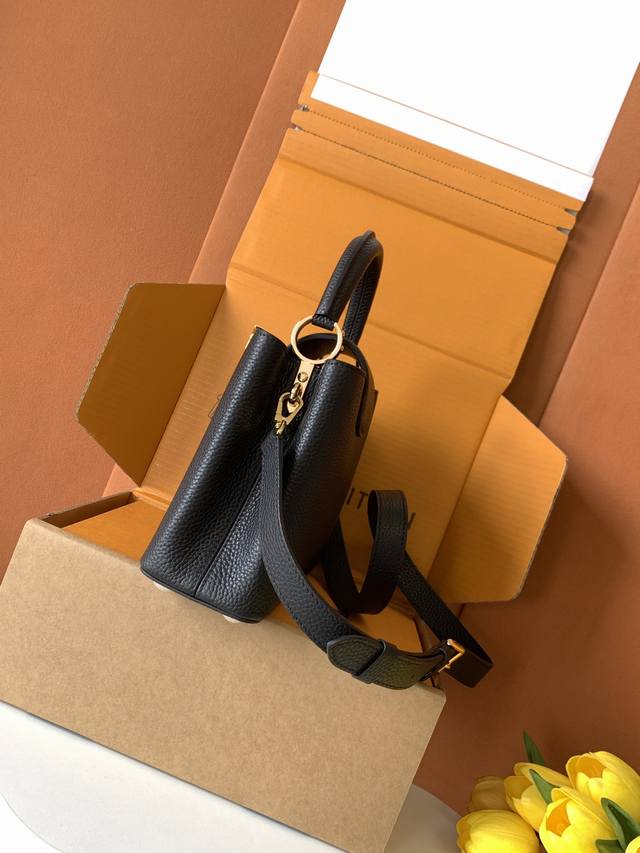 Special Grade All-Steel M25404 Black and Gold This Capucines Bb handbag is crafted from classic Taurillon cowhide leather, perfectly sized for both day and night. Shell-like Monogram florals adorn the hem of the bag, complementing the elegant hardware. The interior compartment features multiple pockets, and the detachable shoulder strap offers a variety of carrying options. 27 x 17.3 x 9 cm length x height x width Taurillon cowhide leather