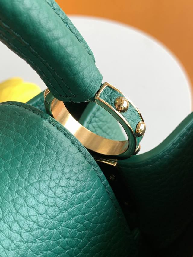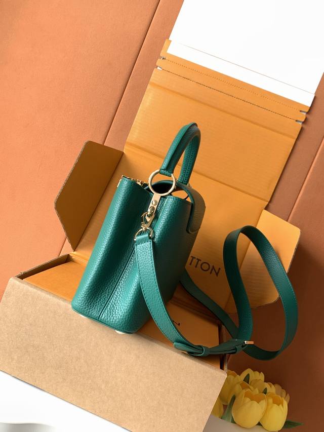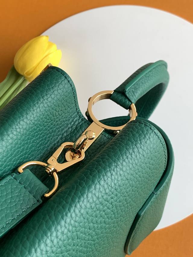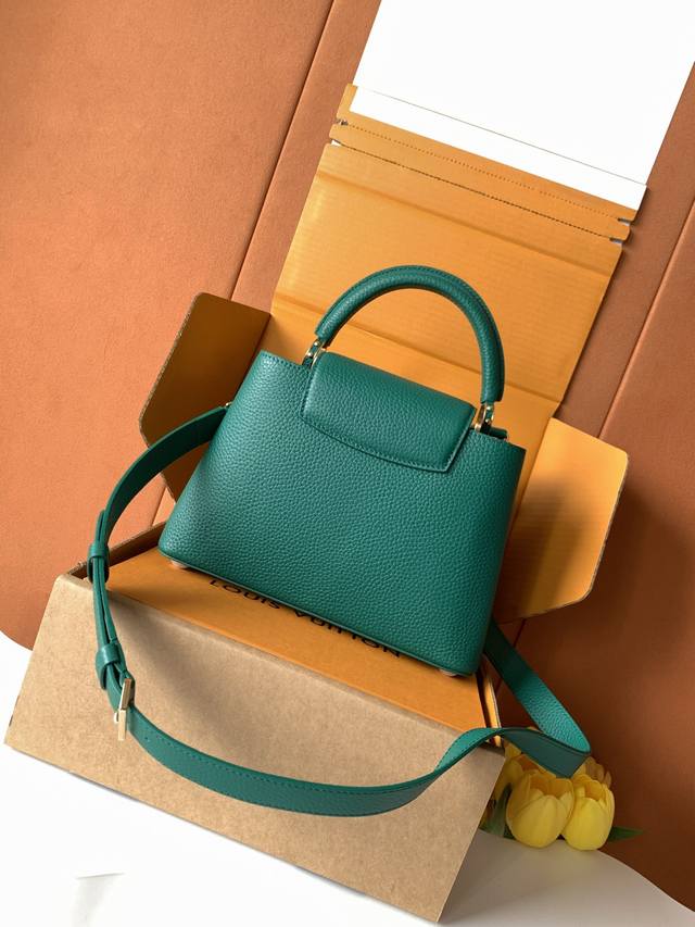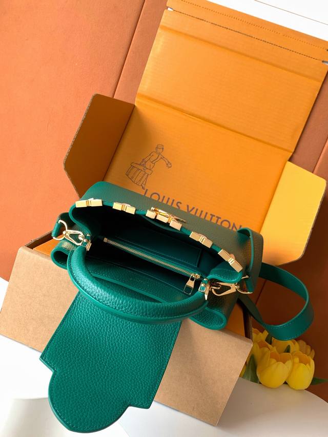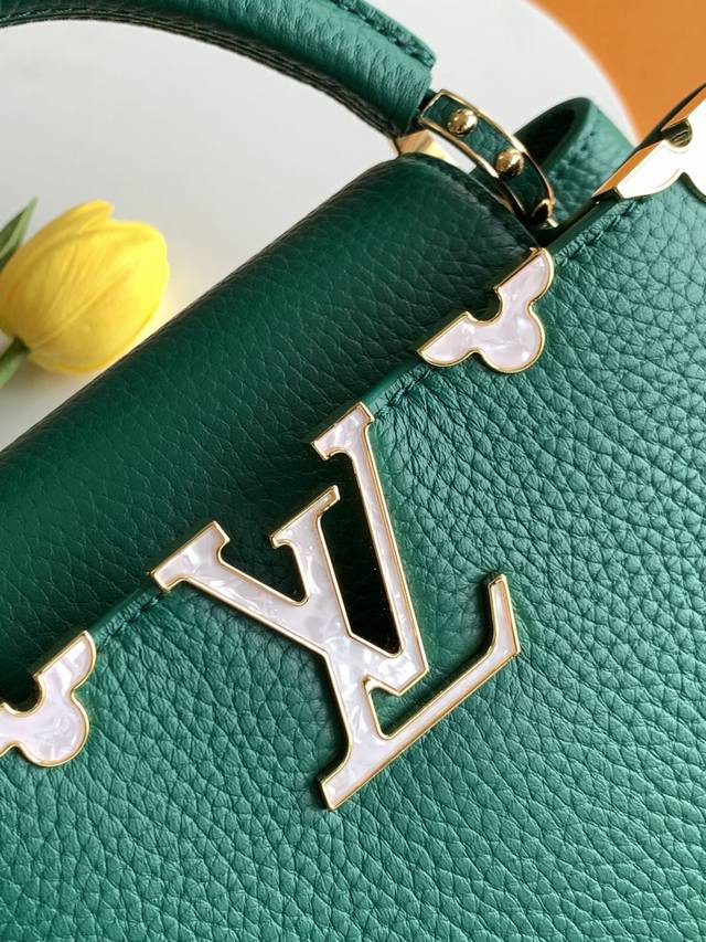 Special Grade All-Steel M25404 Dark Green Gold This Capucines Bb handbag is made from classic Taurillon imported cowhide leather, and is sized just right for both day and night occasions. Shell-textured Monogram flowers adorn the upper edge of the bag, complementing the elegant all-steel hardware . The interior compartment features multiple pockets, and the detachable shoulder strap provides a variety of carrying options. 27 X17.3X9 cm length X height X width Taurillon imported cowhide leather