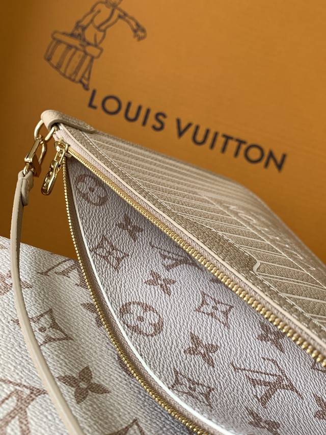 This reversible Neverfull Inside Out Medium bag is the perfect bag for work and weekends. One side is crafted from Monogram Dune canvas, while the other is crafted from smooth Hazelnut leather, accented with gold hardware. Spacious enough for a laptop and other daily essentials, the bag features side straps and hooks for easy styling, while a removable zippered pouch provides storage for smaller items. The