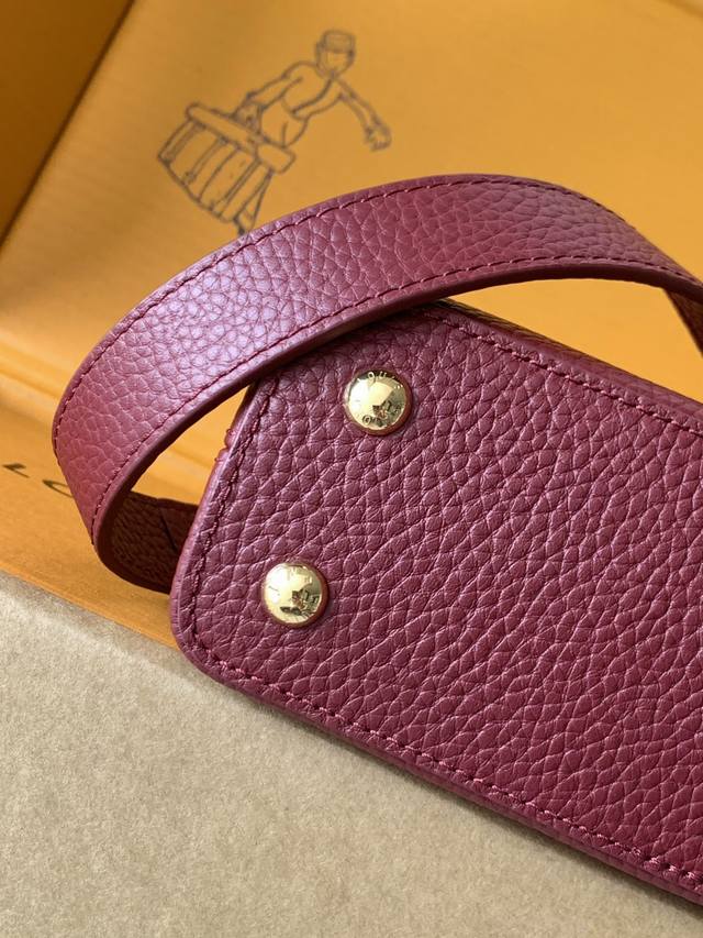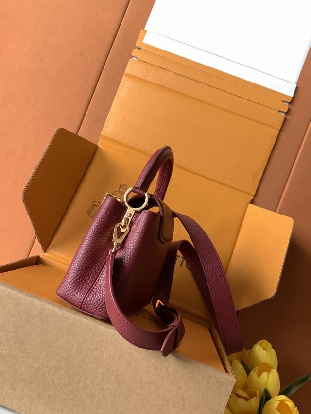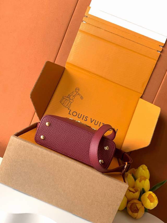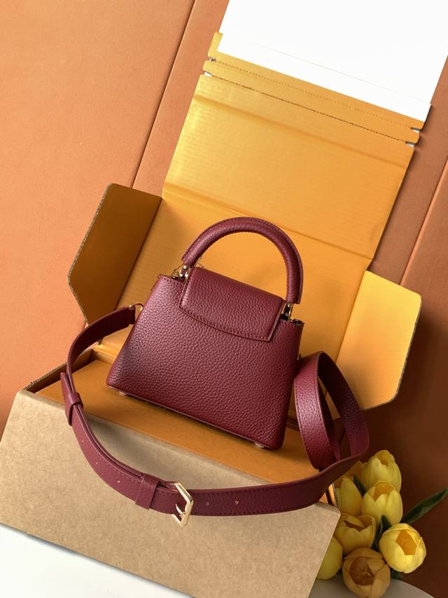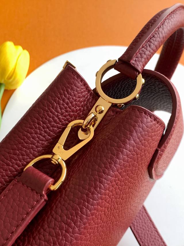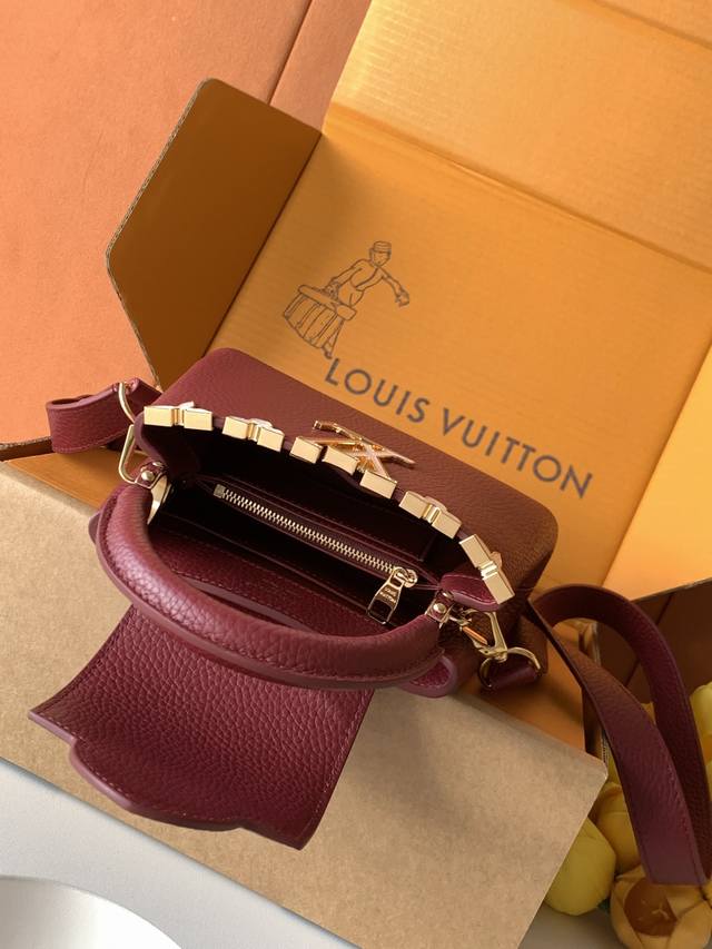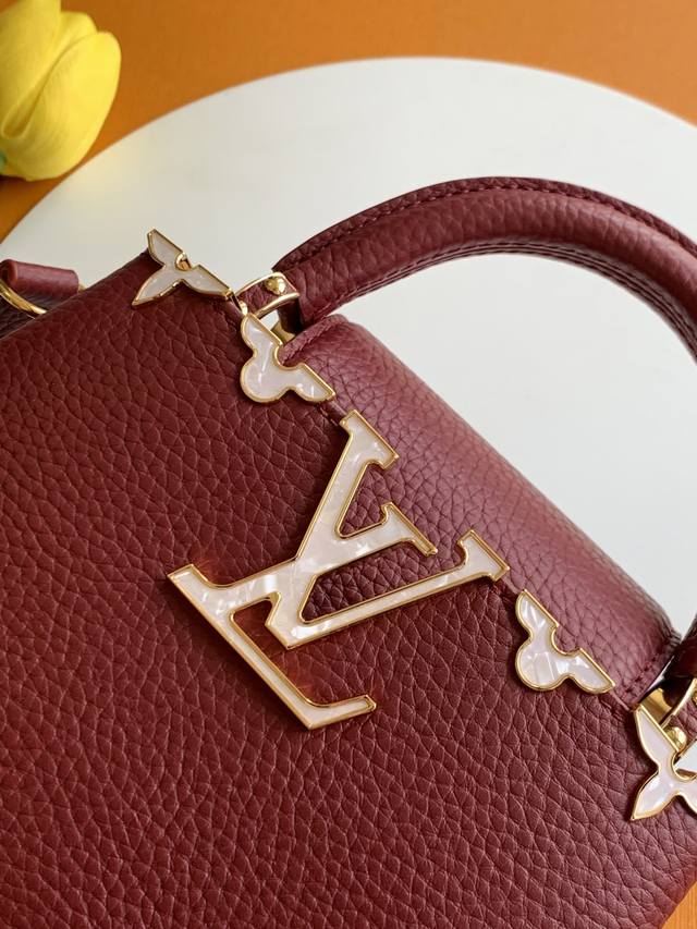 Special-grade all-steel M11341 bordeaux gold. This Capucines mini handbag, from the Flower Crown collection, features a sophisticated design infused with shell-like Monogram florals and elegant hardware. The interior compartments house multiple pockets, and the detachable shoulder strap allows for versatile carrying options. 21 x 13.6 x 8 cm (length x height x width): Taurillon cowhide leather (