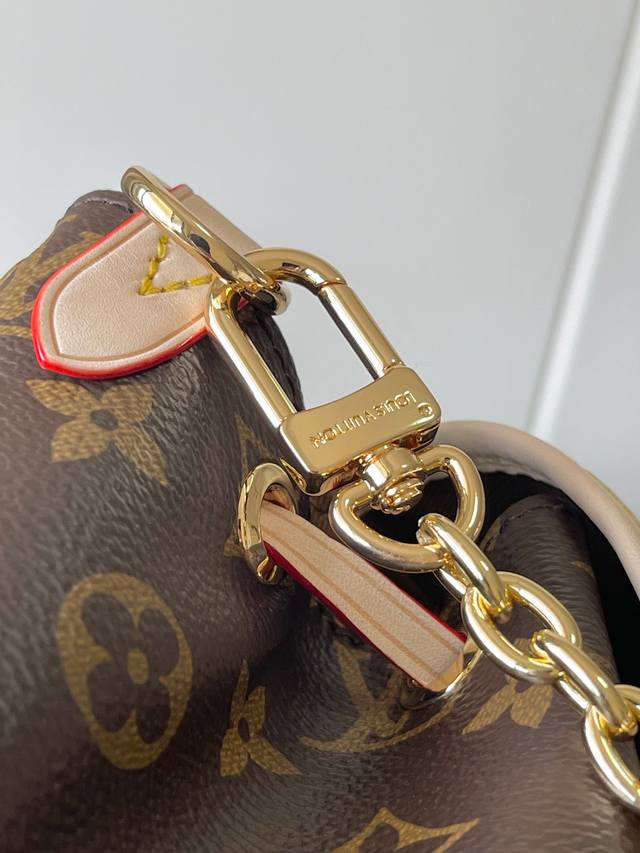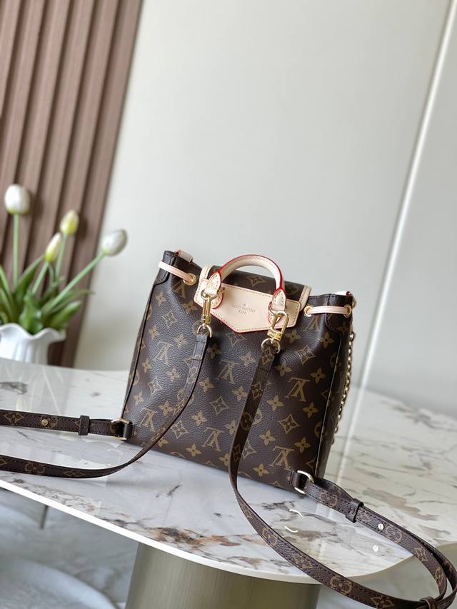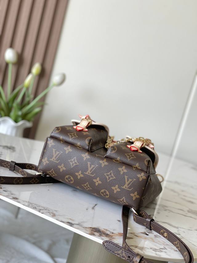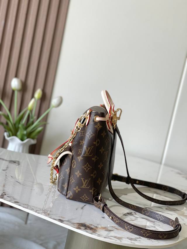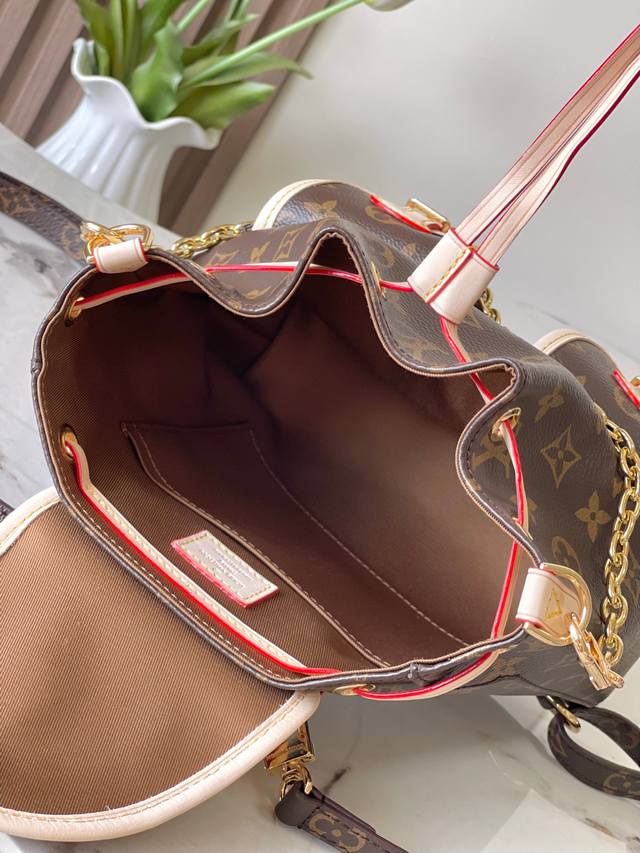 ) This compact and practical Excursion small backpack is made of Monogram canvas with leather trim, exuding a hiking style. The main compartment has an adjustable slide closure, and there are two buckle pockets on the front. In addition to the top handle, it also has a chain for easy switching between carrying methods. 21.0 X 23.0 X 10.0 cm (Length X Height X Width) (