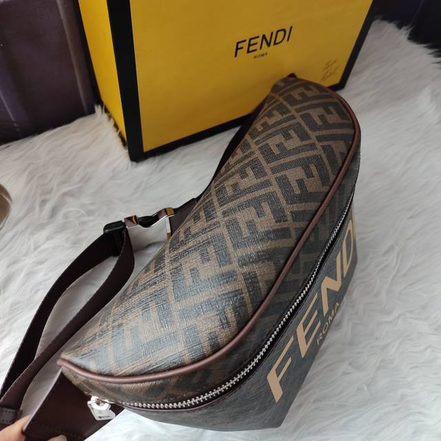 Style No. 7Va562 Fabric silk screen printing, zipper closure waist bag, adjustable belt, decorated with Ff pattern. Size 46Cm-18Cm-9Cm