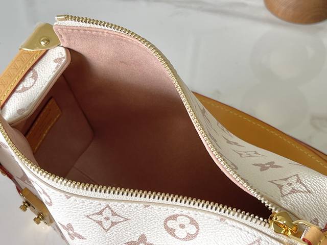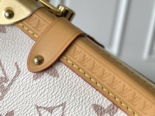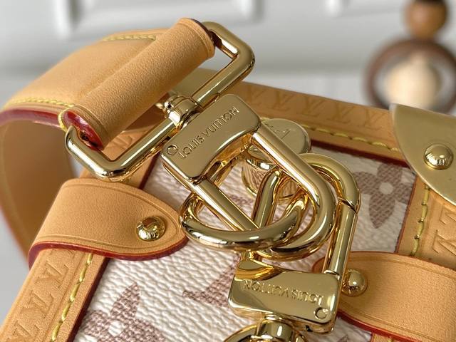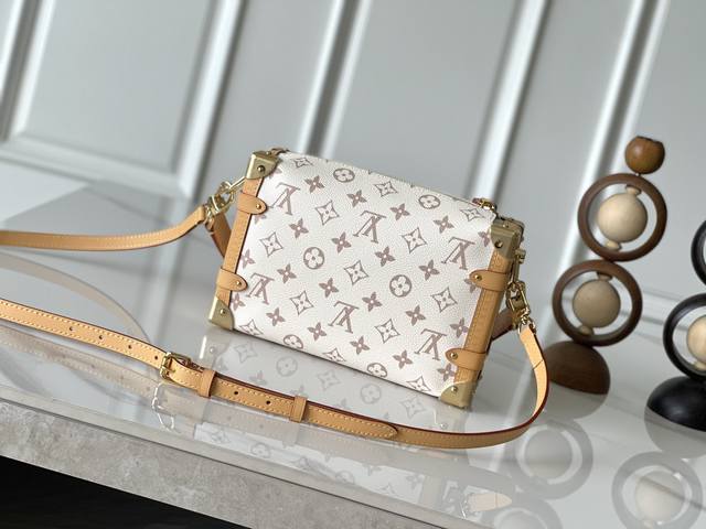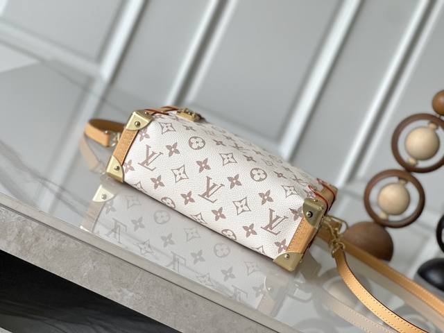 The chip-coded version 26287 White Floral Side Trunk Medium handbag features the brand's signature Monogram canvas dyed in a soft sand dune hue, accented by cowhide leather trims for a visual contrast. The striking S-Lock closure and metal corners add a touch of sophistication.