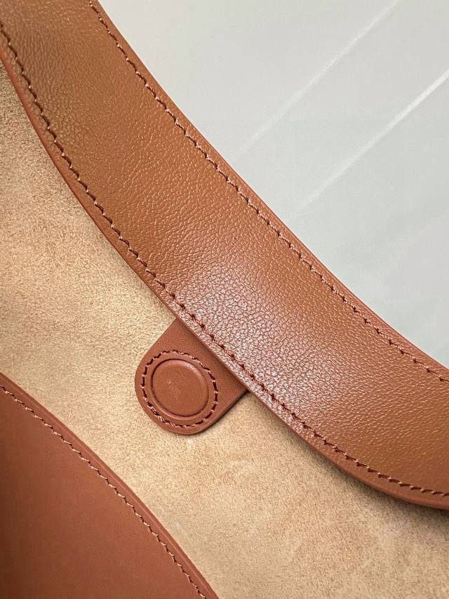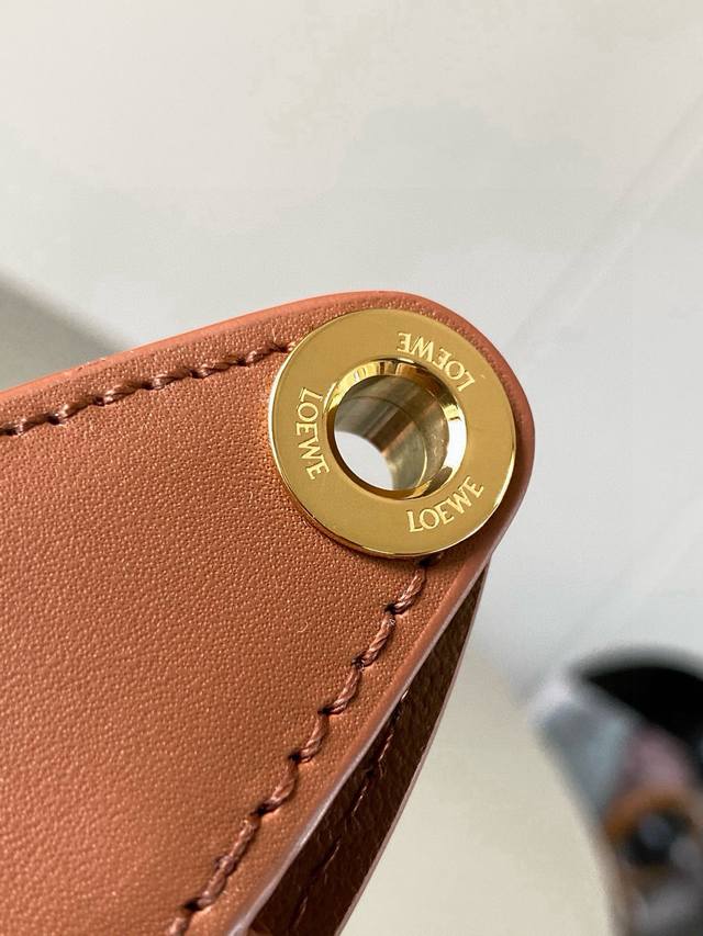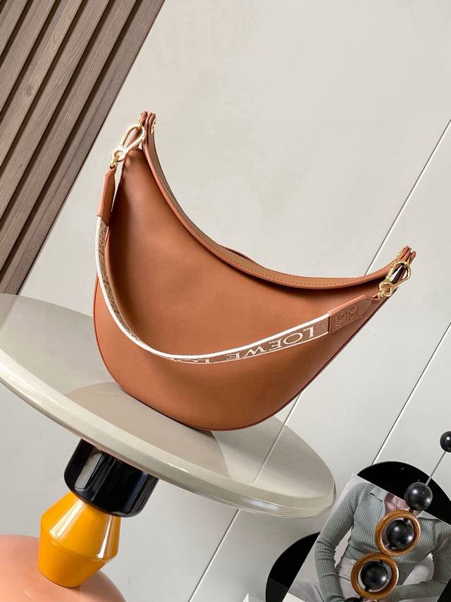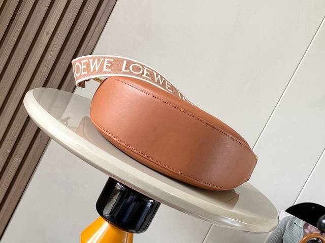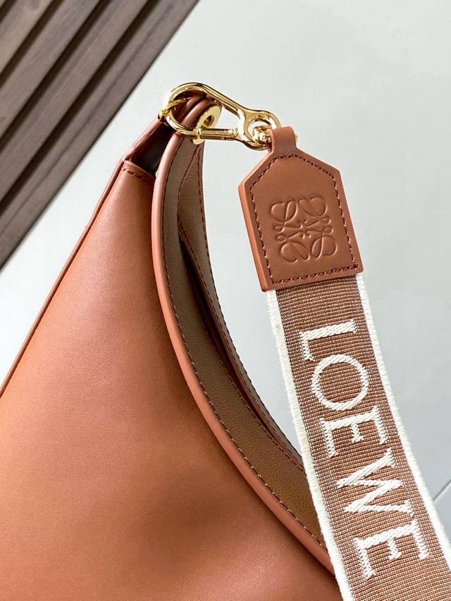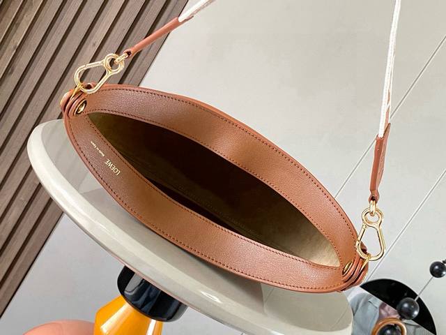 The Luna half-moon Hobo bag features a sculpted silhouette with curved double-lip closures, concealed sliding eyelets, and a detachable shoulder strap for added styling versatility. This version is crafted from satin cowhide leather and features a L0Ewe jacquard strap. The bag features a detachable shoulder strap, an internal slip pocket, and a herringbone cotton canvas lining. Its flowing crescent shape elongates the body without being too tight, providing exceptional comfort. The wide shoulder straps provide a comfortable fit without compressing the shoulders. The snap-button closure allows for easy access, and the spacious interior easily accommodates sunglasses and a folding umbrella. Concealed sliding loops on both sides allow for the attachment of a shoulder strap or pendant, making it a stylish and versatile bag for everyday wear. Size: 34cm to 9cm to 30cm. Model: 9072. Color: Brown.