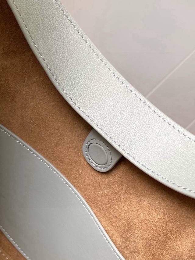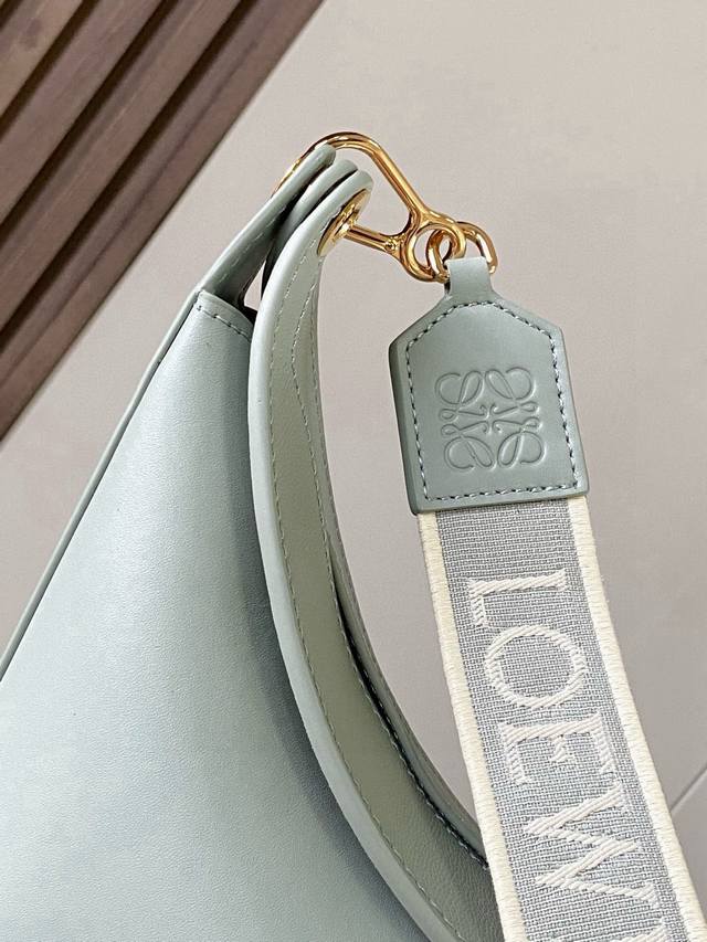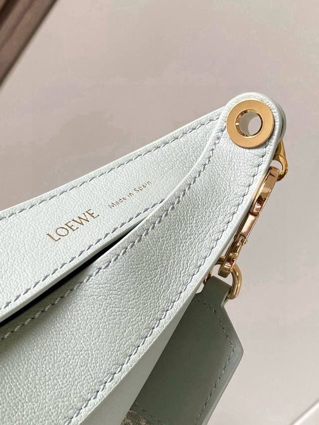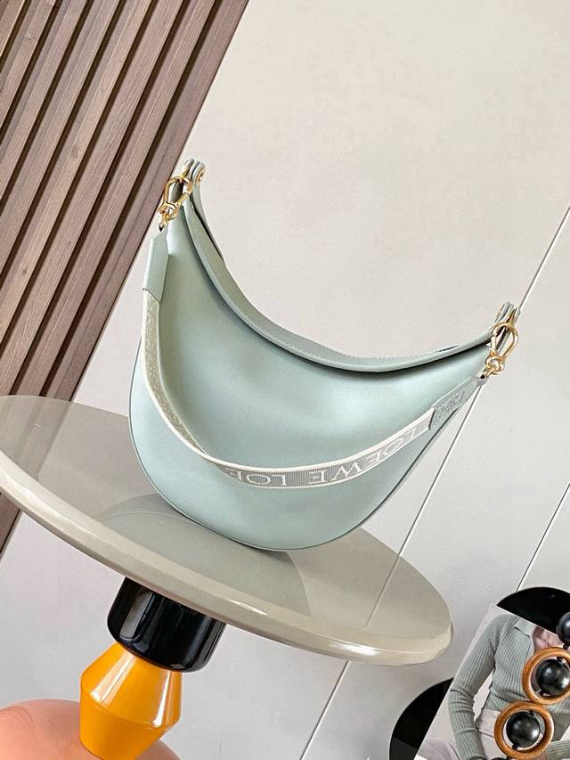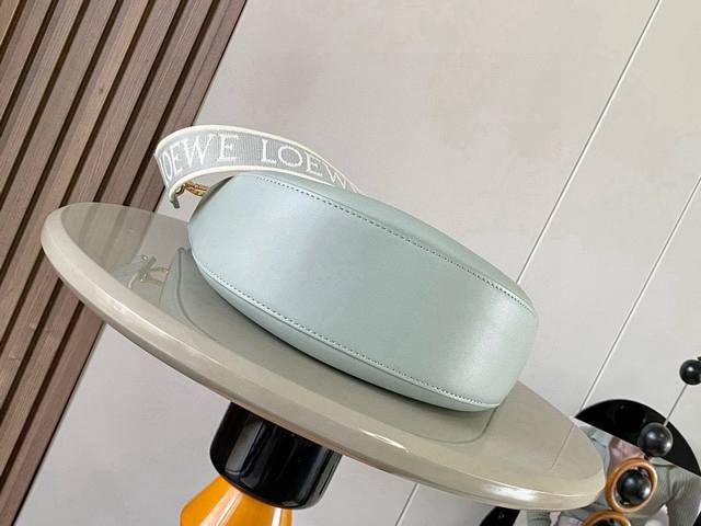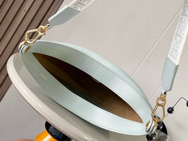 The Luna half-moon Hobo bag features a sculpted silhouette with curved double-lip closures, concealed sliding eyelets, and a detachable shoulder strap for added styling versatility. This version is crafted from satin cowhide leather and features a L0Ewe jacquard strap. The bag features a detachable shoulder strap, an internal slip pocket, and a herringbone cotton canvas lining. Its flowing crescent shape elongates the body without being too tight, providing exceptional comfort. The wide shoulder straps provide a comfortable fit without compressing the shoulders. The snap-button closure allows for easy access. The large interior holds enough space for sunglasses and a folding umbrella. Concealed sliding loops on both sides allow for the attachment of a shoulder strap or pendant, making it a stylish and versatile bag for everyday wear. Size: 34cm to 9cm to 30cm. Model: 9072. Color: Powder Gray.