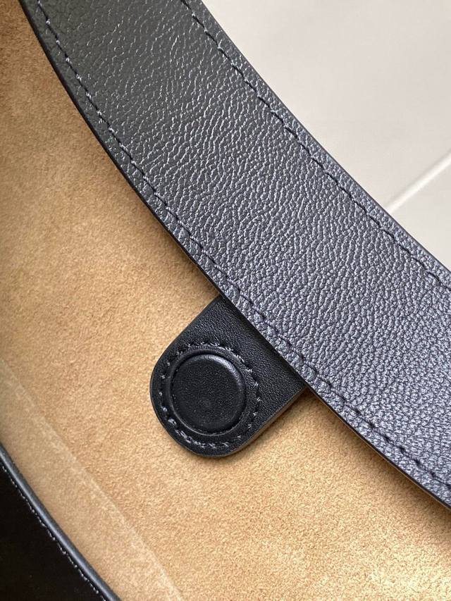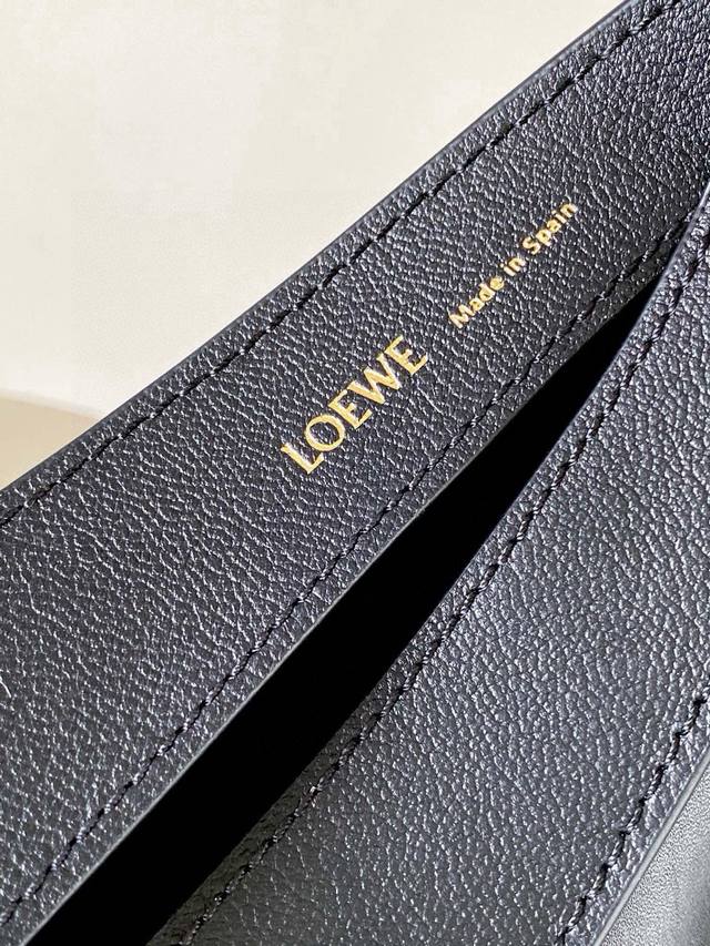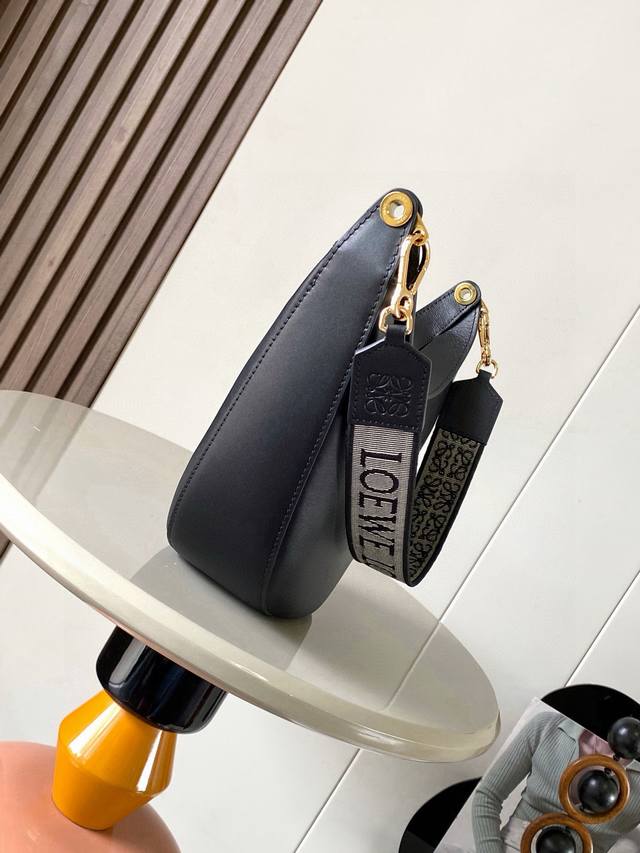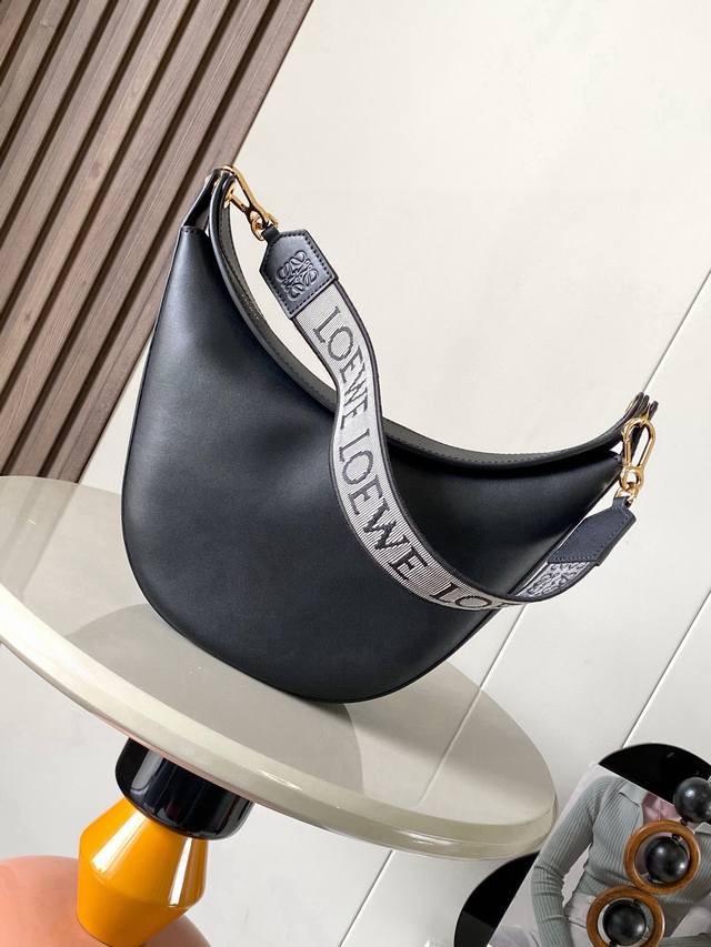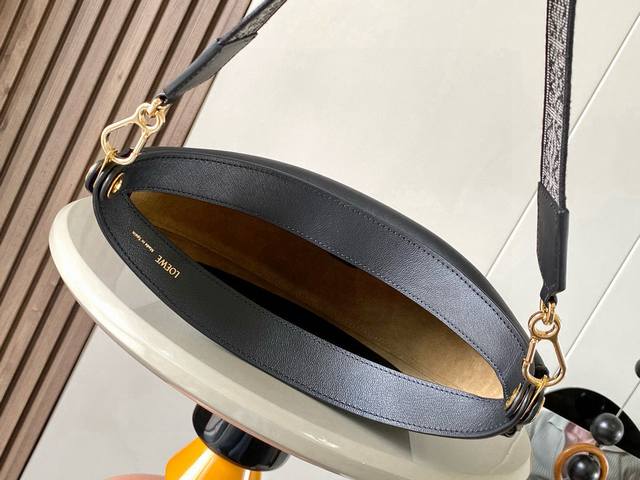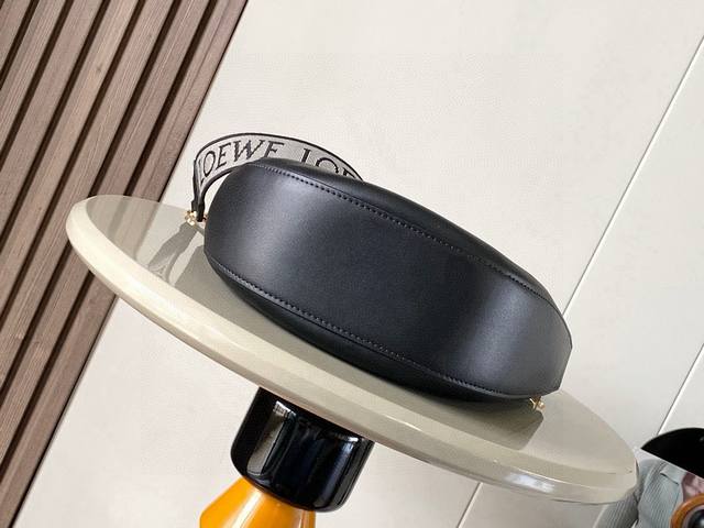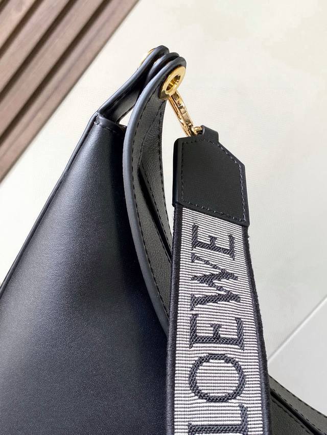 The Luna half-moon Hobo bag features a sculpted silhouette with curved double-lip closures, concealed sliding eyelets, and a detachable shoulder strap for added styling versatility. This version is crafted from satin cowhide leather and features a L0Ewe jacquard strap. The bag features a detachable shoulder strap, an internal slip pocket, and a herringbone cotton canvas lining. Its flowing crescent shape elongates the body without being too tight, providing exceptional comfort. The wide shoulder straps provide a comfortable fit without compressing the shoulders, while the snap-button closure allows for easy access. The large interior also offers ample storage, making it perfect for sunglasses or a folding umbrella. Concealed sliding loops on both sides allow for the attachment of a shoulder strap or pendant, making it a stylish and versatile bag for everyday wear. Size: 34cm to 9cm to 30cm. Model: 9072. Color: Black.