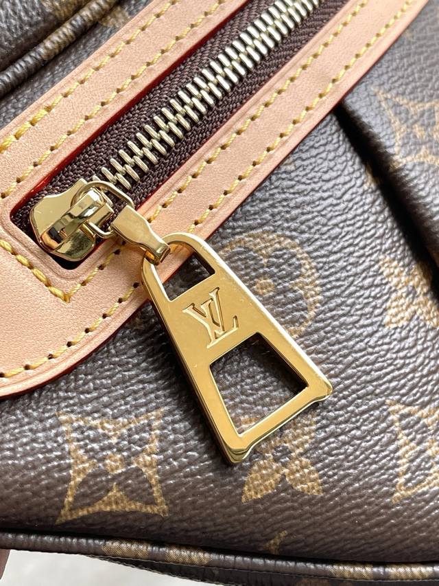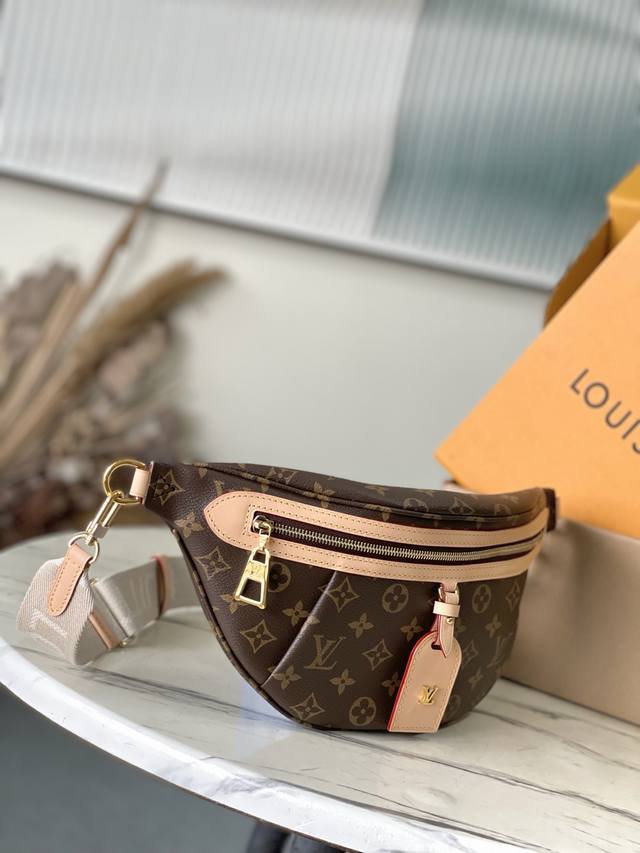 The premium original M46784 High Rise waist bag is crafted from soft Monogram coated canvas for a close-fitting fit. Its lightweight design allows it to be worn under a jacket. A detachable cowhide name tag and a fabric shoulder strap create a sporty look. Dimensions: 38 x 16 x 8 cm