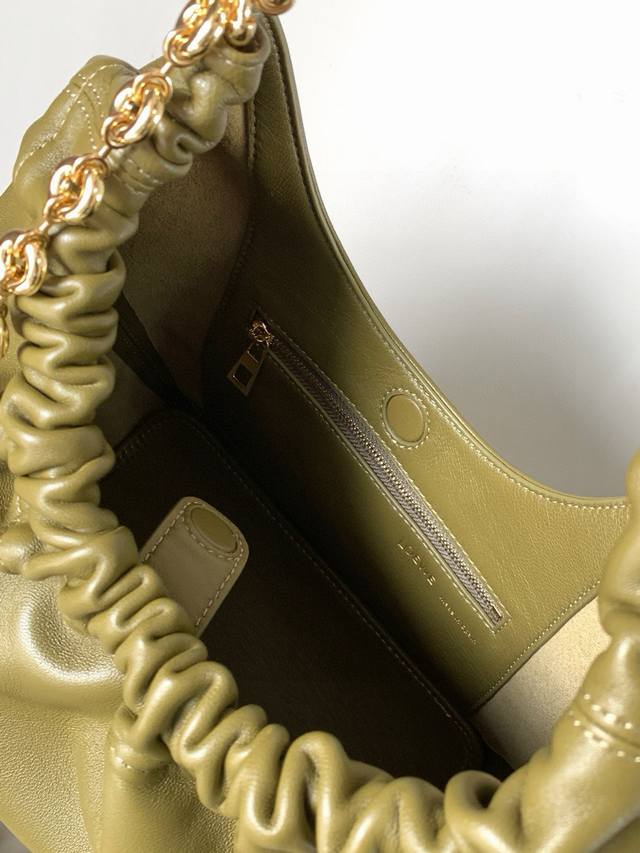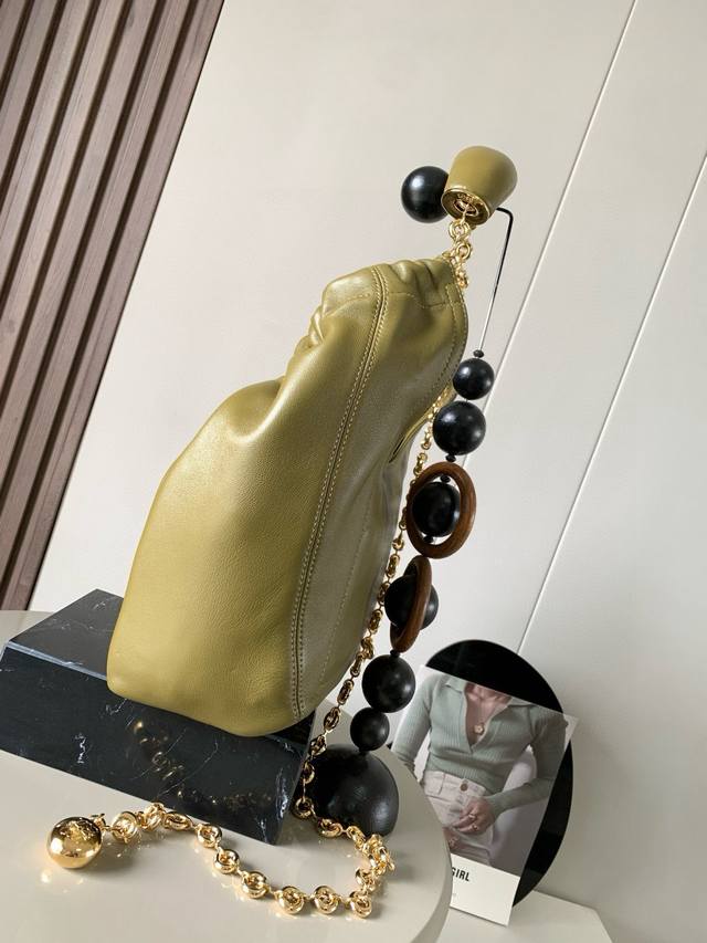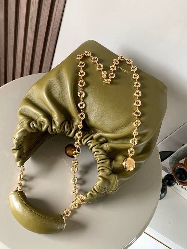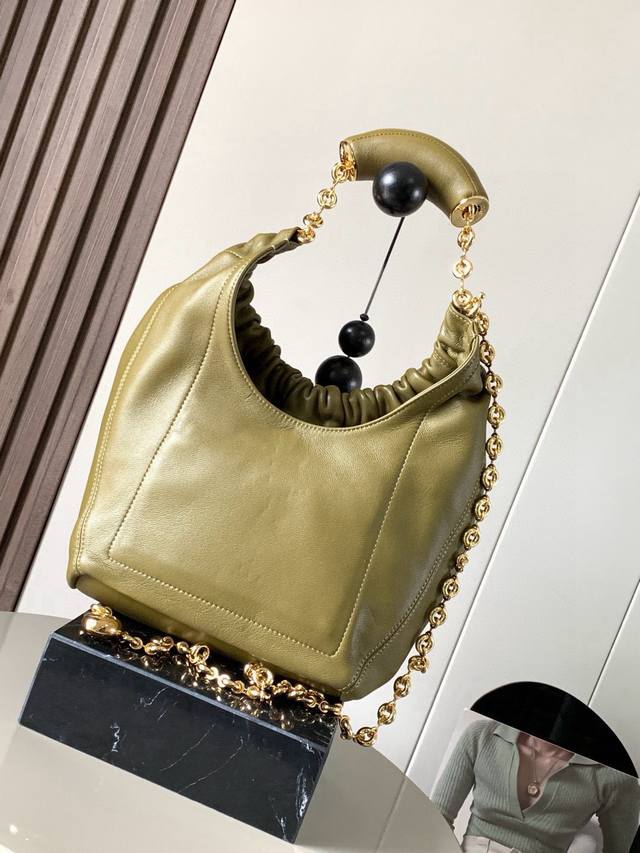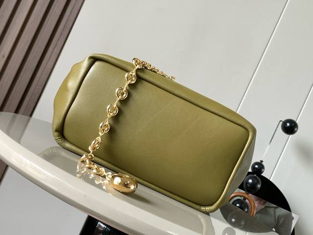 The small Nappa sheepskin Squeeze handbag, the same model as celebrities, is a new exquisite and soft handbag. The newly released Squeeze handbag is made of soft and silky Mellow Nappa lambskin. The unlined structure effectively reduces the weight of the bag and looks lighter. The crescent-shaped bag opening is closed with an elegant ruffle, creating a relaxed and casual attitude. Another highlight of this bag is the ergonomic Squeeze airbag handle paired with an exquisite brass donut chain. The length can be adjusted through the chain link or an extension chain can be added to achieve different carrying methods such as hand, shoulder, and crossbody. The airbag handle can be freely slid into the position to improve comfort. An Anagram pebble pendant is embellished at the bottom of the chain, adding smart details to the bag.