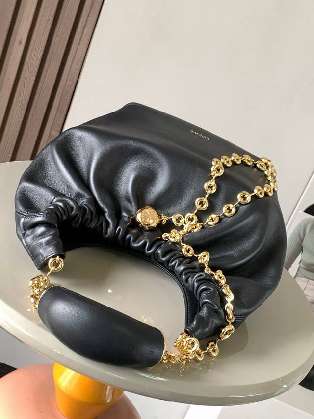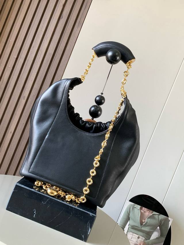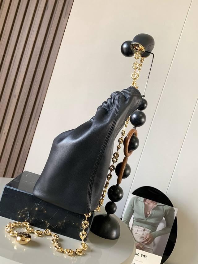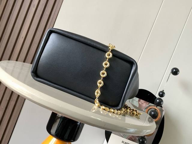 The small Nappa sheepskin Squeeze handbag, the same model as celebrities, is a new exquisite and soft handbag. The newly released Squeeze handbag is made of soft and silky Mellow Nappa lambskin. The unlined structure effectively reduces the weight of the bag and looks lighter. The crescent-shaped bag opening is closed with an elegant ruffle, creating a relaxed and casual attitude. Another highlight of this bag is the ergonomic Squeeze airbag handle paired with an exquisite brass donut chain. The length can be adjusted through the chain link or an extension chain can be added to achieve different carrying methods such as hand, shoulder, and crossbody. The airbag handle can be freely slid into the position to improve comfort. An Anagram pebble pendant is embellished at the bottom of the chain, adding smart details to the bag.
