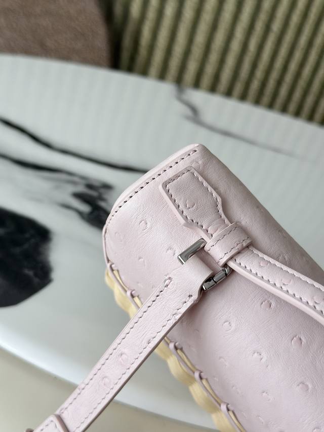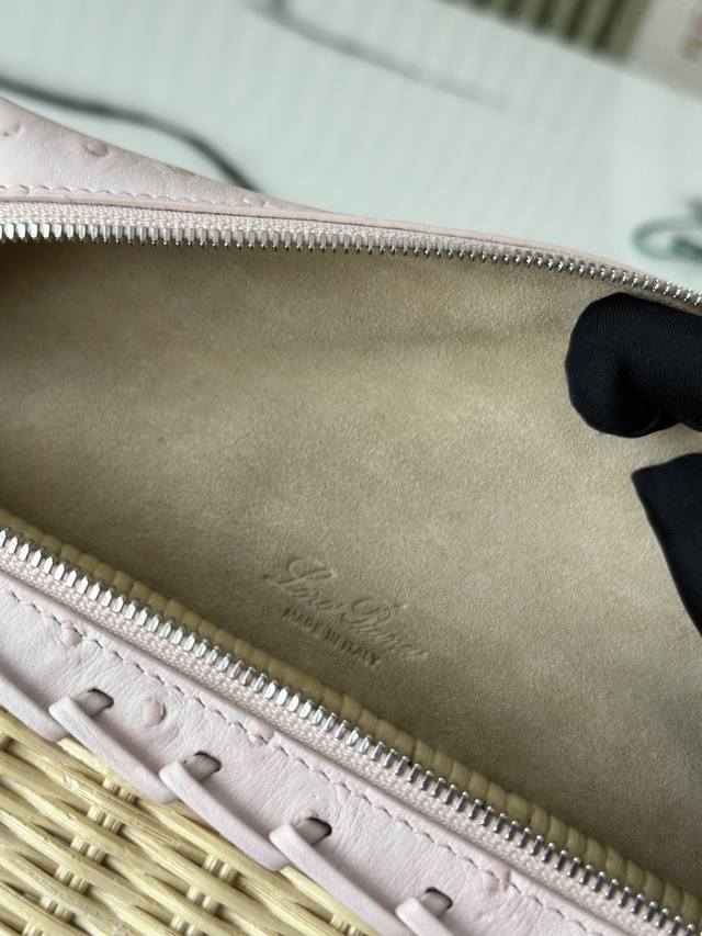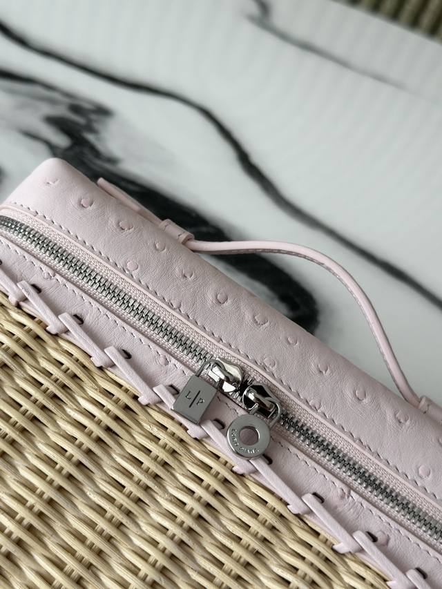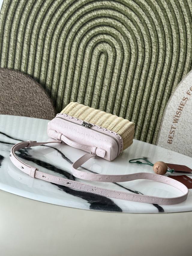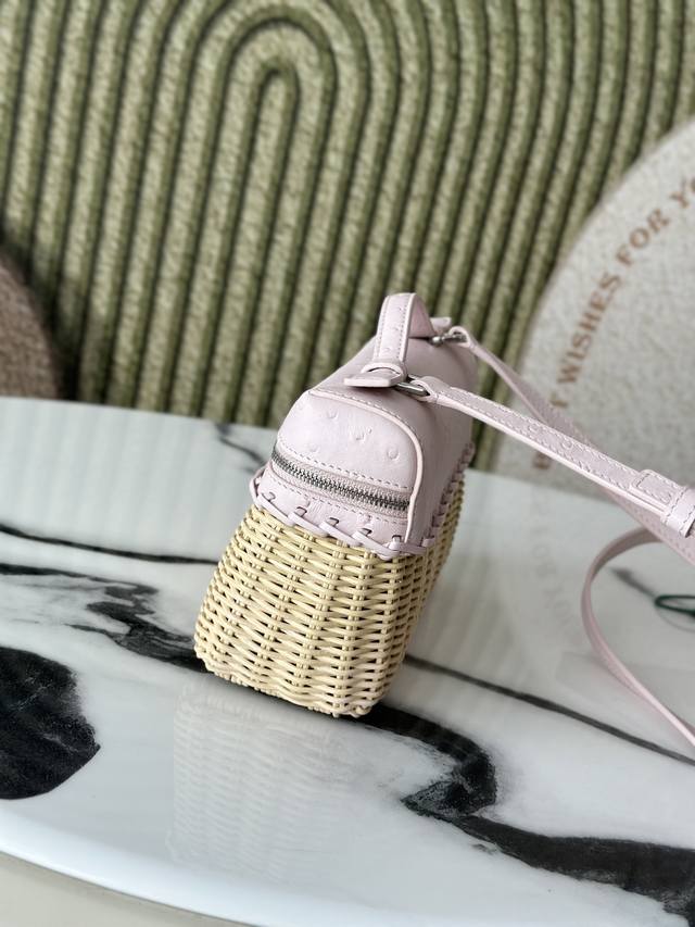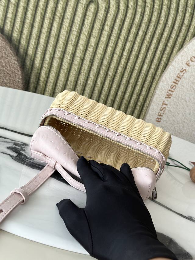 This compact Extrapocket bag combines handwoven bamboo and rattan with the brand's unique cowhide leather. Lightweight and versatile, the detachable shoulder strap allows for crossbody wear. Its classic design blends traditional weaving techniques with modern functionality, making it an ideal gift. Leather handles and shoulder strap. Two-way zipper closure with Mycharms detailing. Dimensions: 19 x 11 x 7 cm. Color: Peony Pink. Material: Bamboo fiber. Lining: Cowhide leather. Trim: Cowhide leather with ostrich pattern.