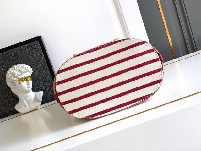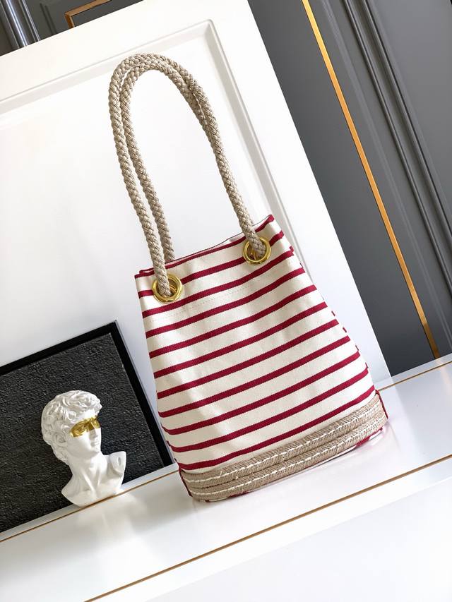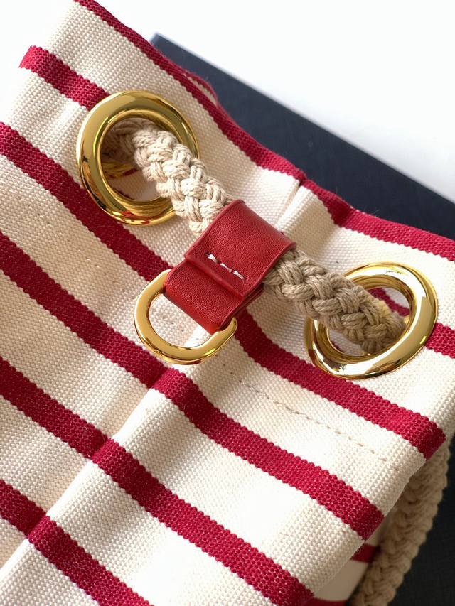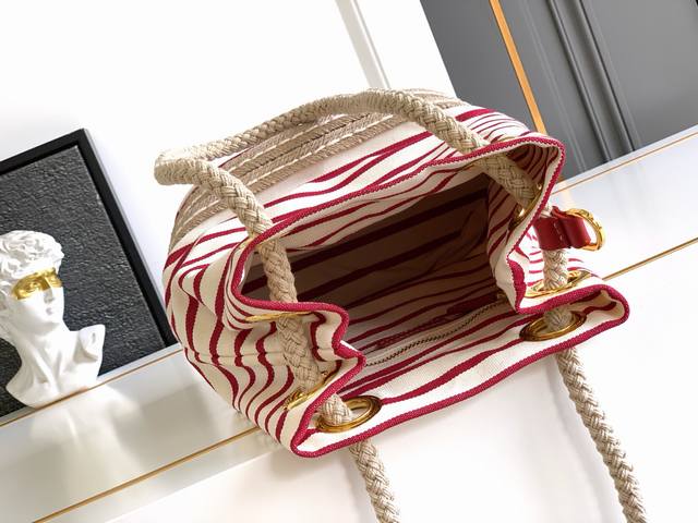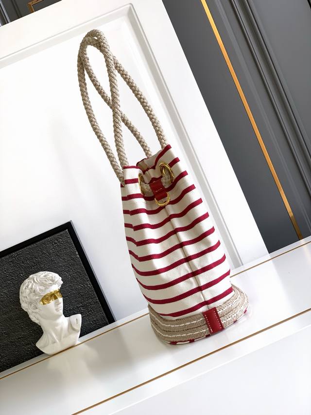 This fabric bucket bag features a nautical striped pattern, adding a touch of color. The base is inspired by espadrilles, and the rope is another detail that symbolizes the nautical world, creating a rich summer vibe. Premium hardware and ample storage create a casual and stylish summer essential. It's a timeless favorite, so hurry up and get yours! Model: 1Be082