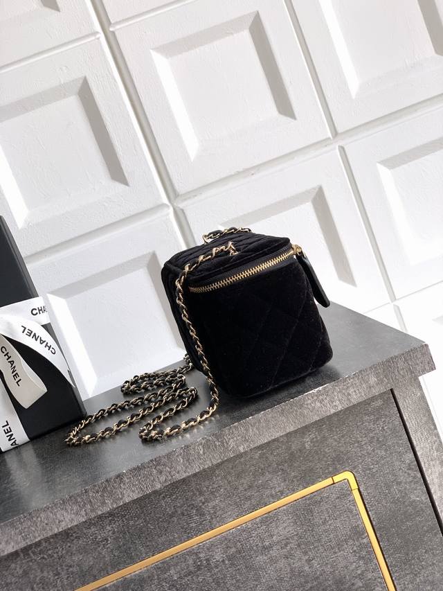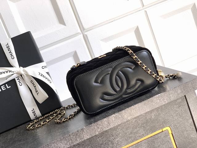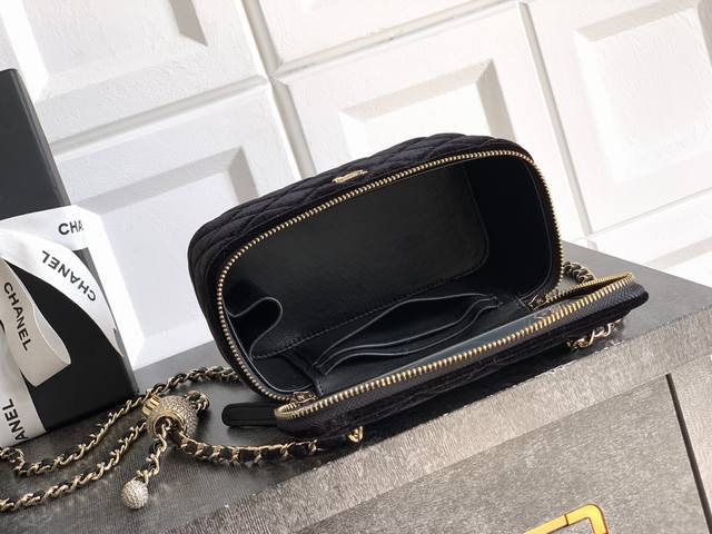 This top-tier, original black 2303 silk, diamond, and gold-beaded Ohanel 25B box bag is a stylish and compact chain compact that can fit a phone. Its impressive capacity is incredibly practical, with three built-in card slots and plenty of room for a card holder. The leather lining includes a small mirror, a thoughtful detail, and a large logo stitched on the bottom. The adjustable chain allows for multiple lengths and carry options. I absolutely love this one, and it's a sure-fire way to carry it. Sizes: 9.5 x 17 x 8 cm.