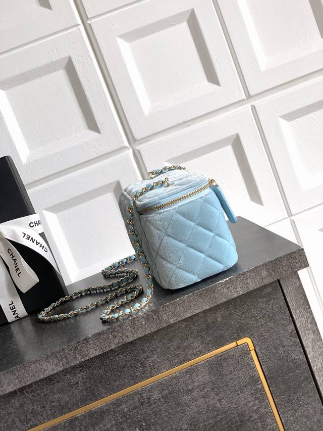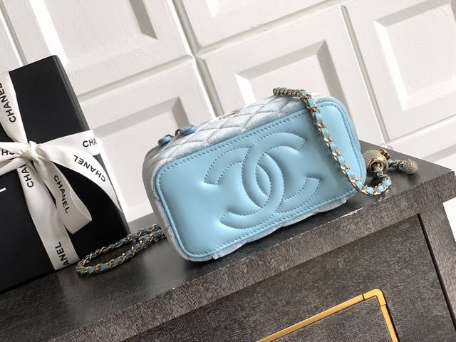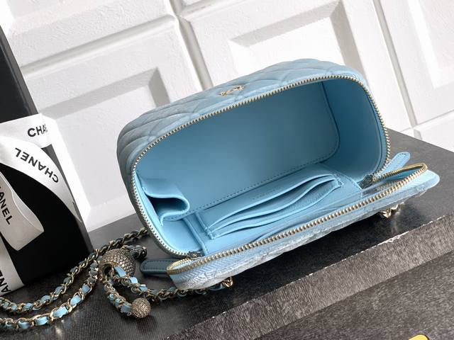 This top-tier, original, glacier blue 2303 silk, diamond, and gold bead clasp Ohanel 25B popular box bag is exquisitely chic. This small chain cosmetic case can fit a phone, boasting impressive capacity and practicality. It comes with three card slots, leaving plenty of room for a card holder. The full leather lining includes a small mirror, a thoughtful detail, and a large logo stitched on the bottom. The adjustable chain allows for multiple lengths and carry options. I absolutely love this one, and it's a sure-fire way to carry it. Sizes: 9.5 x 17 x 8 cm.