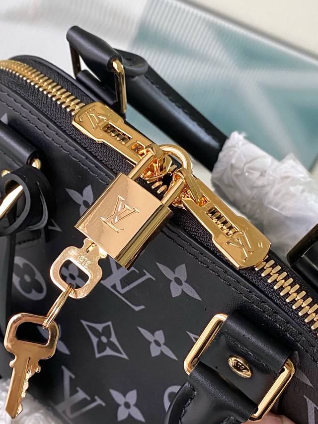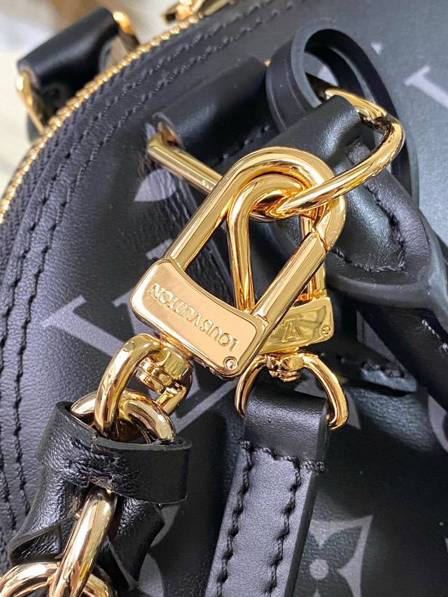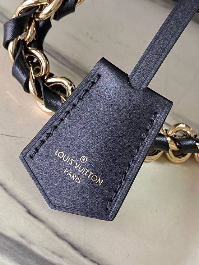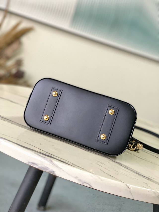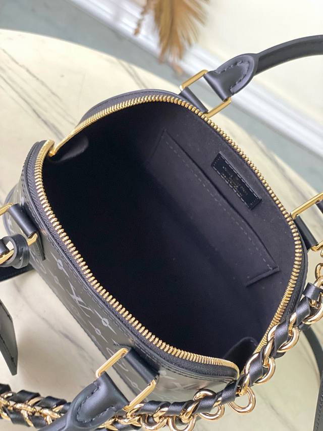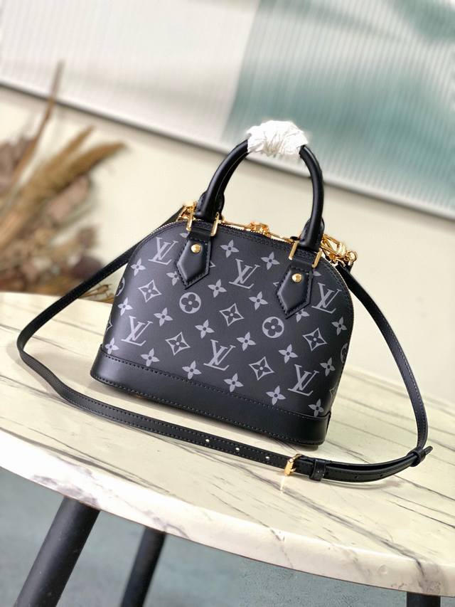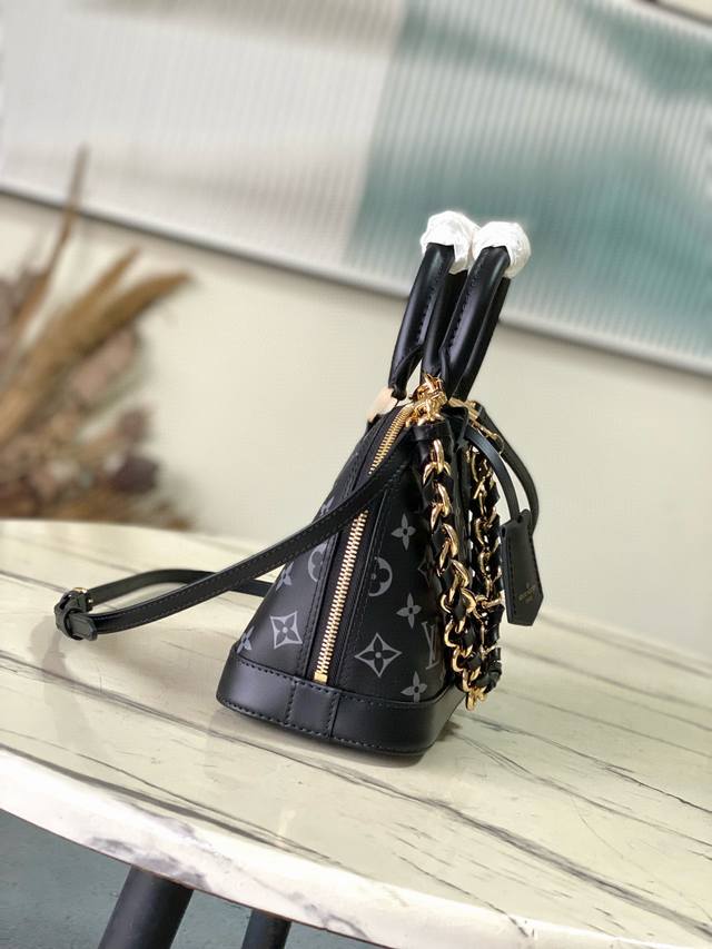 Top-grain leather, original M12289. The Monogram Ink collection introduces the Alma Bb handbag, featuring cowhide leather emblazoned with the brand's Monogram pattern, reinterpreting the original 1934 design. A new braided chain adds an elegant touch, allowing for a shorter shoulder carry option. Dimensions: 23.5
