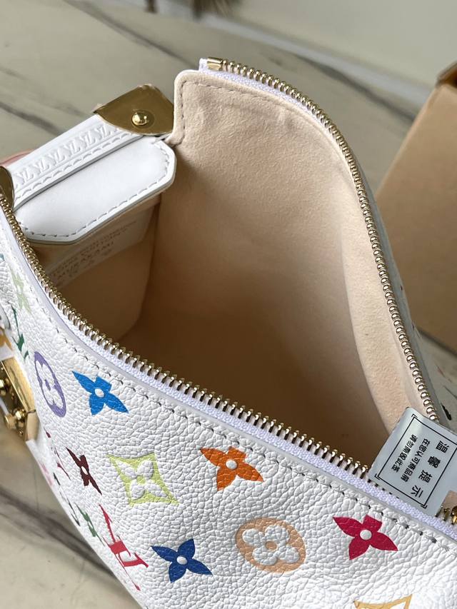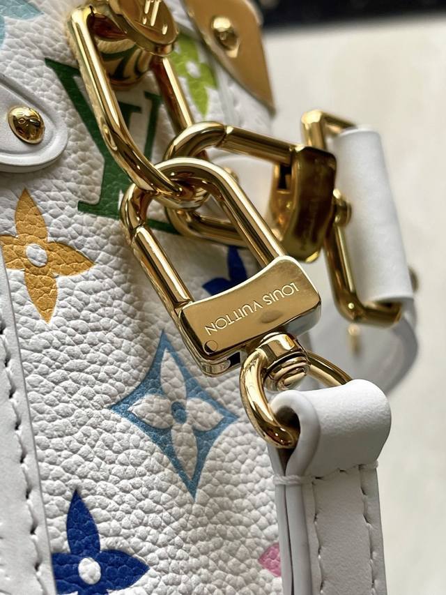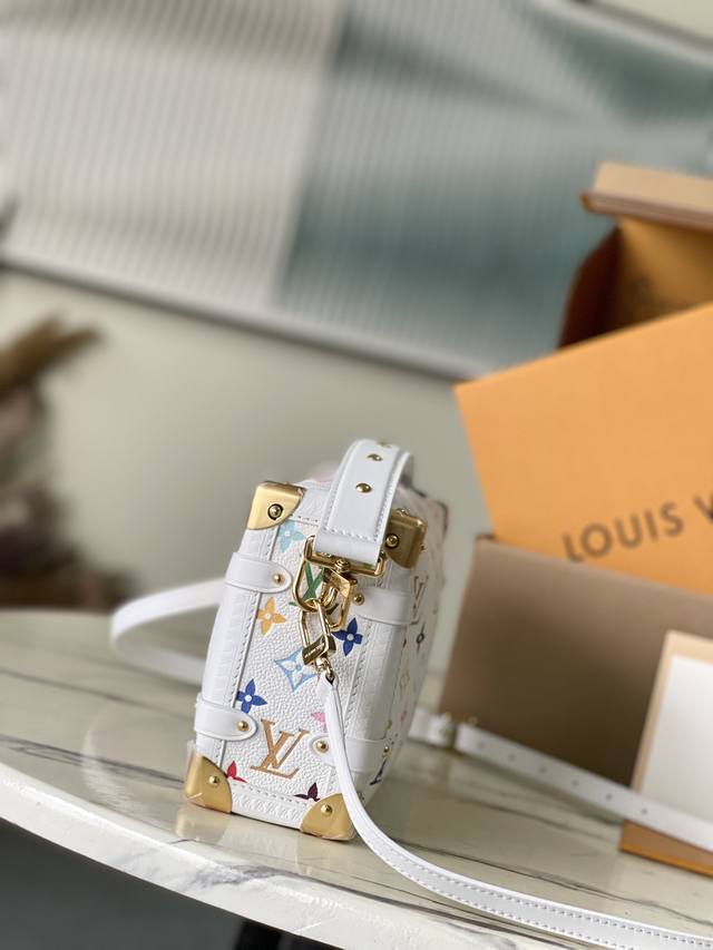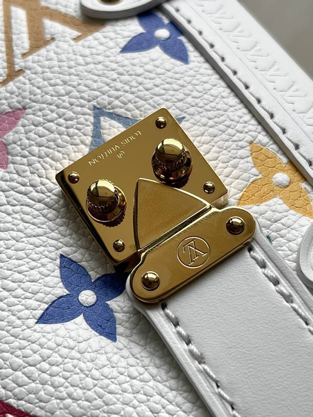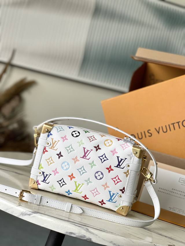 Top-grain leather, original M14046. This Side Trunk medium bag, featuring a playful Monogram pattern, embodies the dynamic style of the X Takashi Murakami re-edition collection. Crafted from supple cowhide leather with reinforced metal corners and the signature S-Lock closure, it easily accommodates everyday essentials. Its boxy shape is a nod to the brand's classic luggage, with a removable studded handle and shoulder strap for versatile carrying. Dimensions: 23.5 x 16 x 8.5 cm