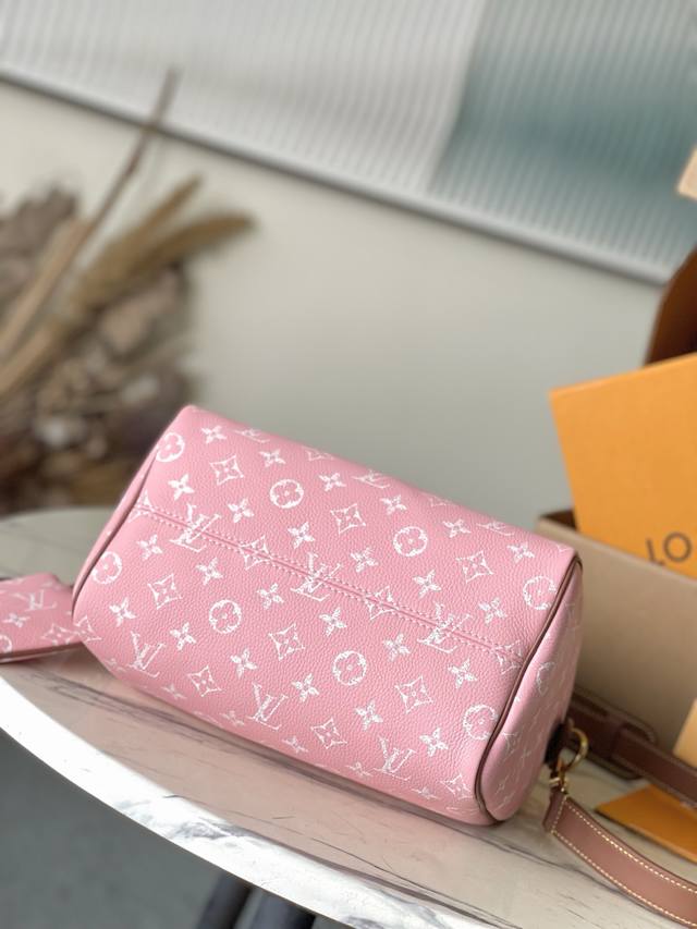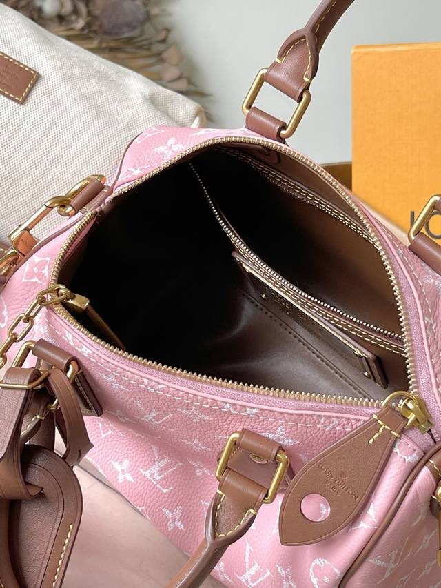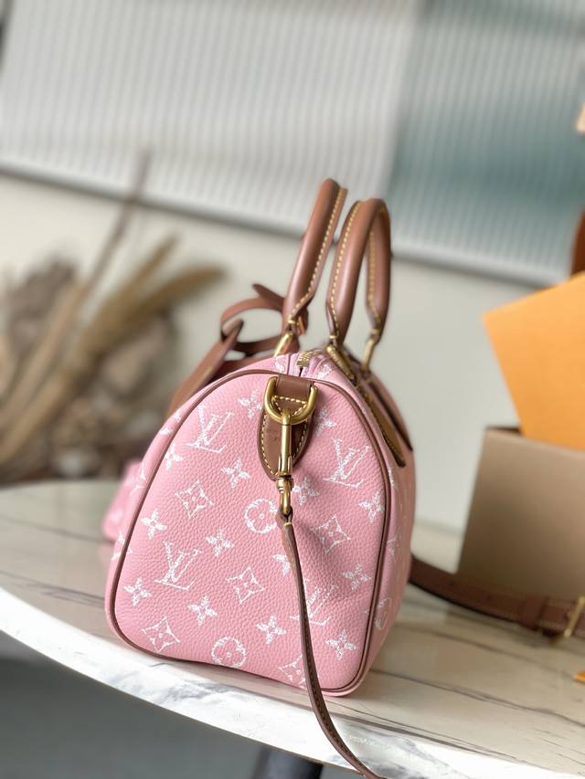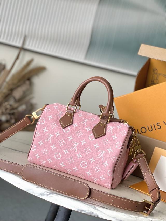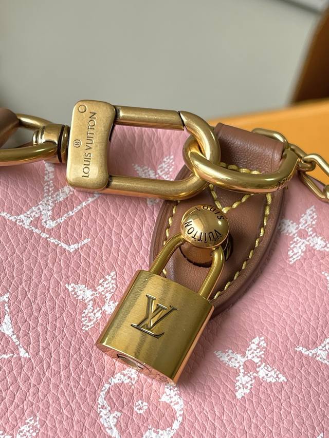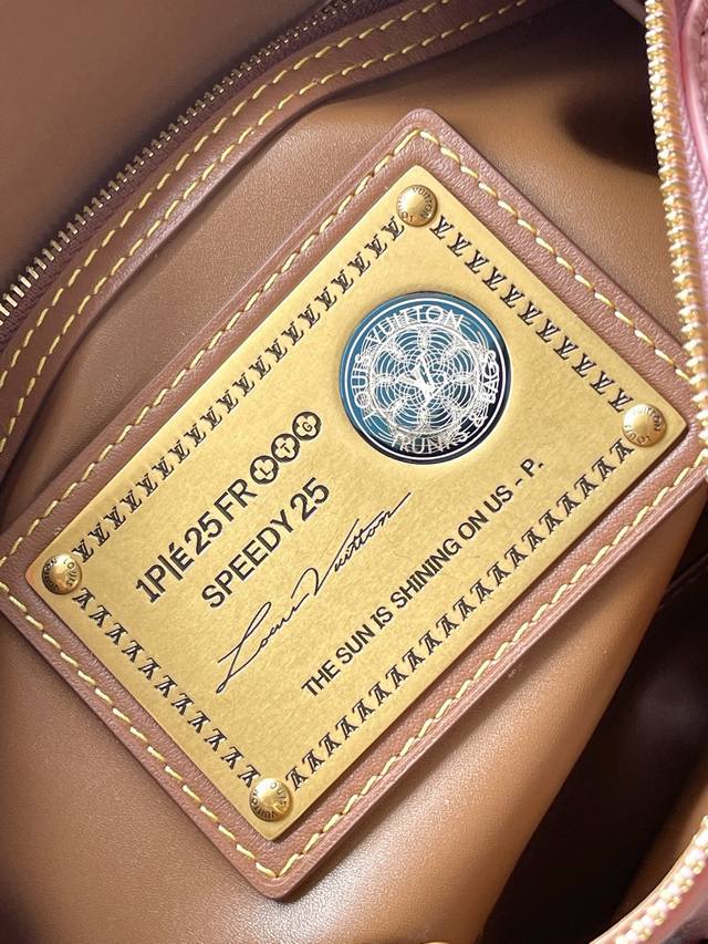 Top-grain leather, original M15279. This Speedy P10 Bandouliere 25 handbag combines a cowhide body and leather trims, embodying both style and functionality. The lobster motif embossed on the handle fasteners symbolizes longevity and prosperity in Japanese culture, and together with the removable leather storage pocket, it continues the Speedy P10 line's signature elements. Dimensions: 25