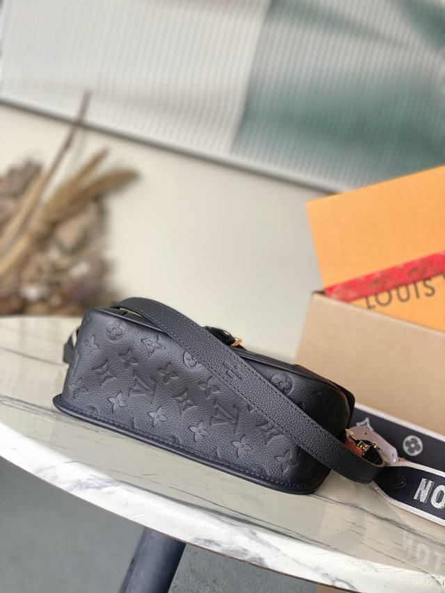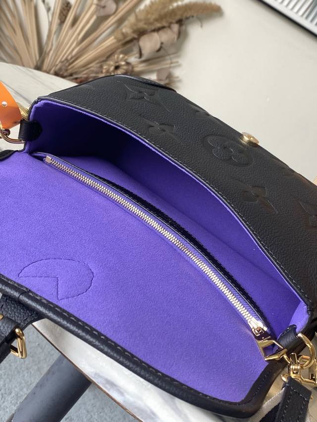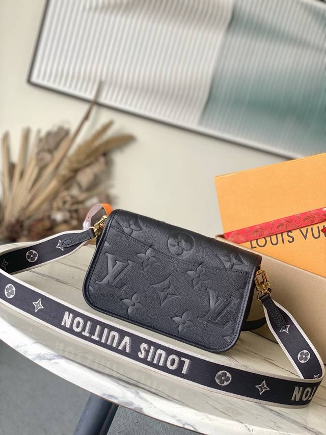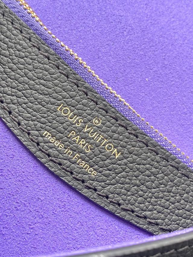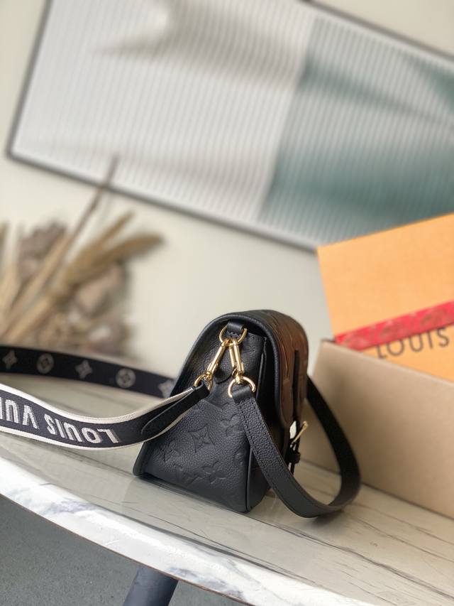 Top-grain leather, original M46386. This Diane handbag features Epi leather embellished with the classic Monogram pattern, complemented by dazzling hardware, making it a sophisticated everyday companion. Perfectly sized for everyday essentials, the zippered interior patch pocket adds functionality, and the detachable, contrasting fabric shoulder strap allows for versatile carrying options. Dimensions: 24 x 15 x 9 cm