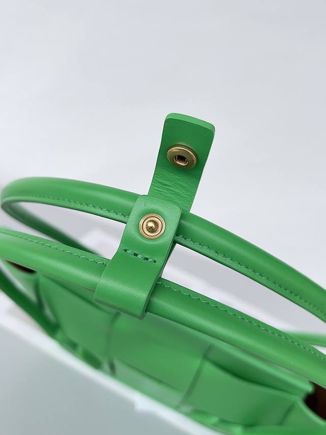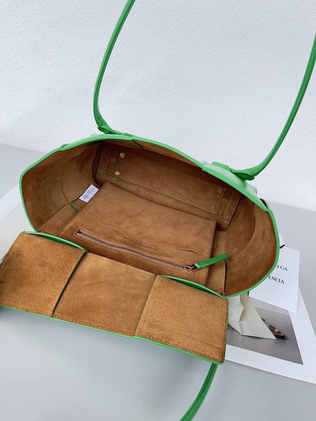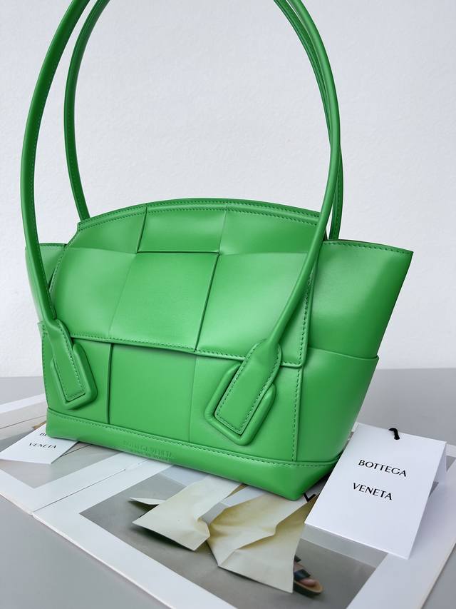 Top-of-the-line: Arco 33 Woven DDD. Made of natural, high-quality calfskin, featuring a wide woven design, an arched top trim, and taut handles, creating a unique and high-end look. DDD Dimensions: 38 x 33 x 6 cm. DDD Style Number: 70013. DDD Color: Parrot Green. DDD