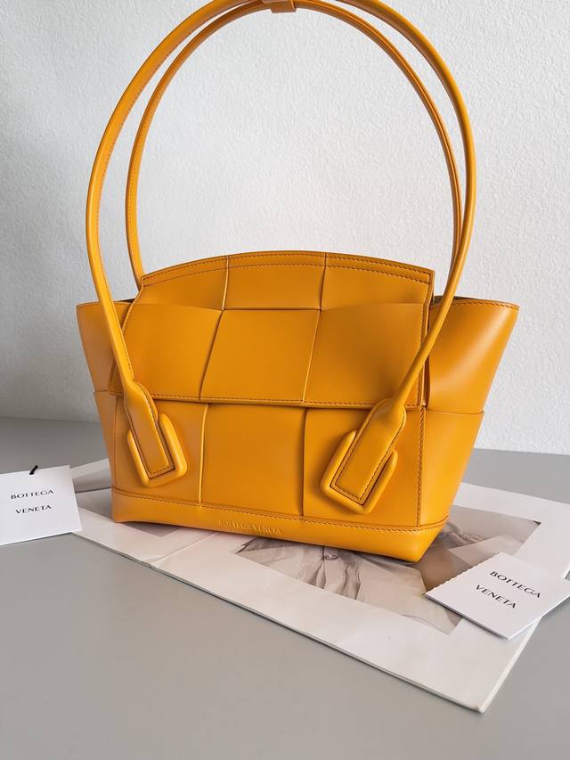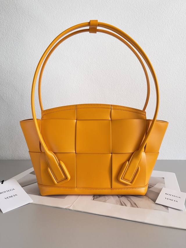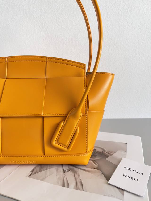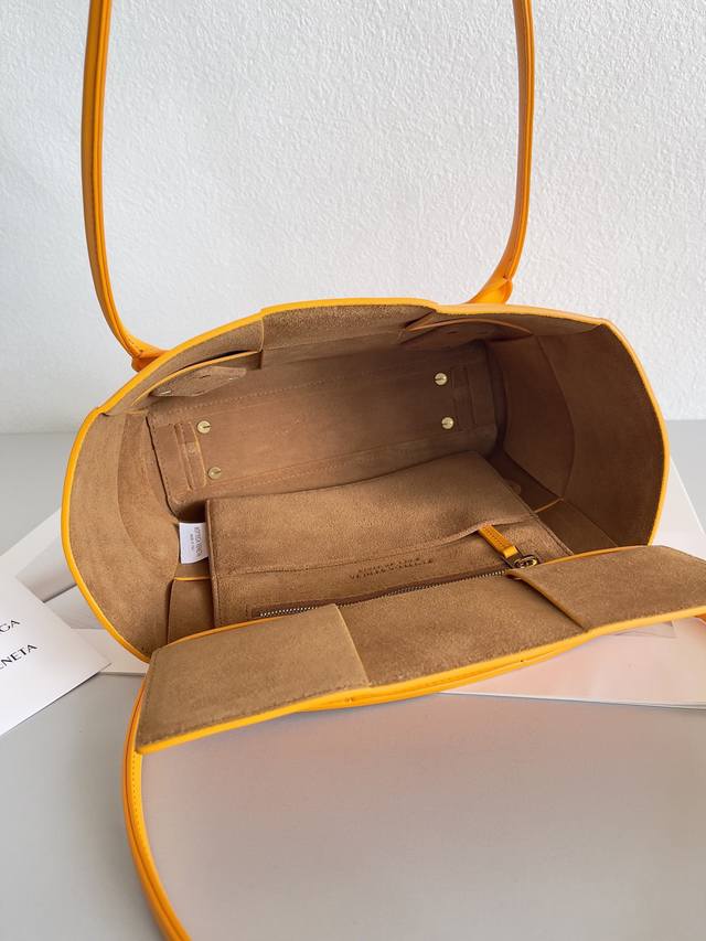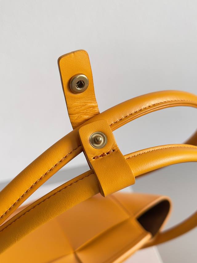 Top-of-the-line: Arco 33 woven DDD. Made of natural, high-quality calfskin, featuring a wide woven design, an arched top trim, and taut handles, creating a unique and high-end look. DDD Dimensions: 38 x 33 x 6 cm. DDD Style Number: 70013. DDD Color: Orange. DDD