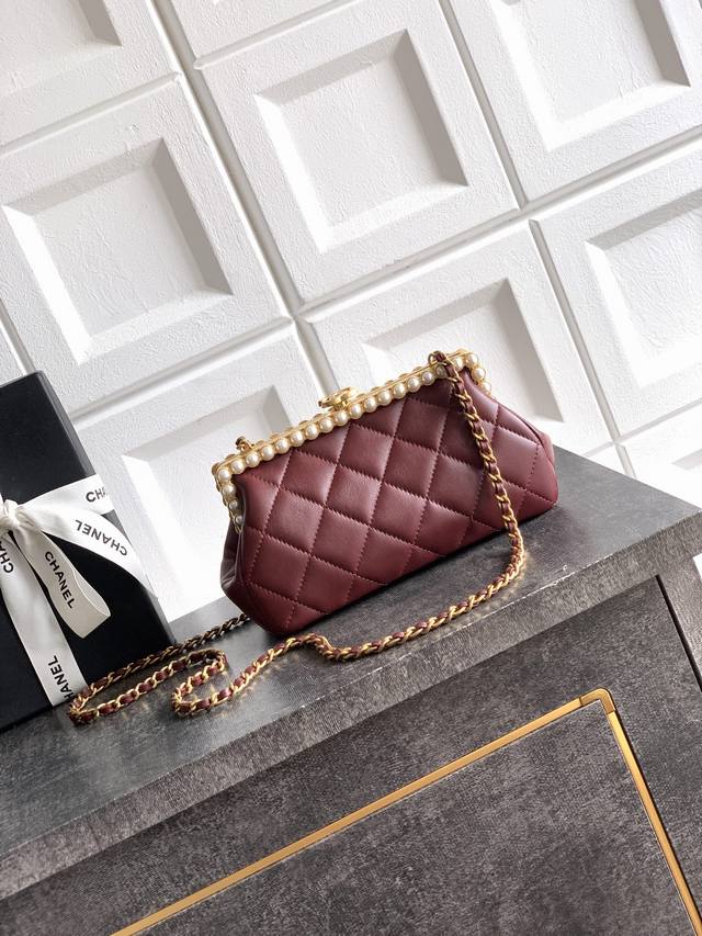 Top-quality original deep burgundy Ohanel 26C pearl high-end evening bag. Exquisite materials and craftsmanship. Classic lambskin, exquisite handcraftsmanship: The high-end handcrafted series uses beads to miniaturize art onto the bag. Poetic elegance! This style highlights magnificence and artistry. Light and shadow are the threads, pearls are the fabric, weaving a dreamlike night. This evening bag, dazzling within its small space, sways gracefully with every step, suitable for pairing with formal gowns or adding a touch of rebellious rock spirit. It's not just an accessory, but a miniature work of art held in the palm of your hand, telling an eternal story of individuality and beauty. Dimensions: 10 x 20.5 x 7.5 cm.
