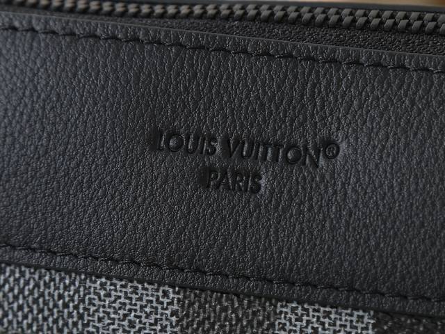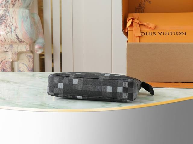 Top-quality original home photo M14926 This Pochette Voyage Souple clutch is crafted from Damoflage Black coated canvas with a soft silhouette and a novel pixelated Damier check pattern for a striking look. The main zippered compartment and magnetic rear pocket allow for quick access to essentials. Dimensions: 30 x 21 x 7.5 cm (Length x Height x Width)