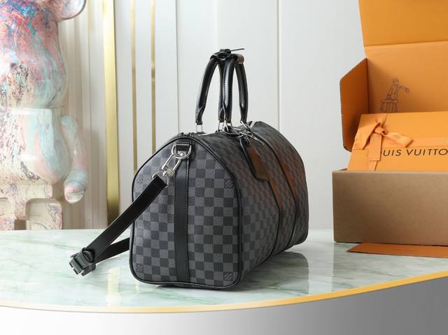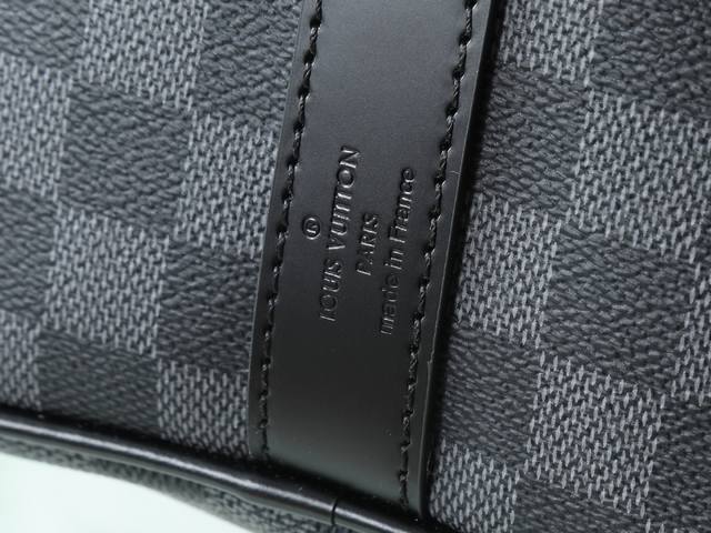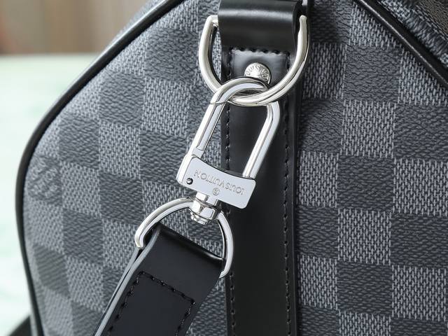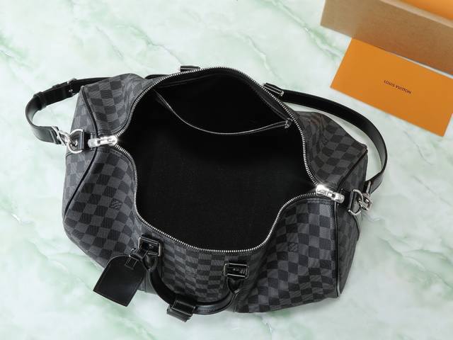 Top-quality original, original, and genuine photos. N41418 Black Keepall 50 Travel Bag with Shoulder Strap. This travel bag, crafted from Damier Graphite canvas, recreates a classic design, offering stylish elegance while remaining lightweight and durable. It features a detachable shoulder strap for practical hand or shoulder carry. Features: 45 x 27 x 20 cm (length x height x width); Specially coated canvas; Natural cowhide trim; Cotton textile lining; Silver-tone hardware; Double zipper closure; Removable leather ID holder and padlock; Carry-on luggage dimensions; Shoulder strap: Removable, adjustable; Half-length strap: 36.0 cm; Half-length strap adjustable to: 50.0 cm; Handles: Double handles (